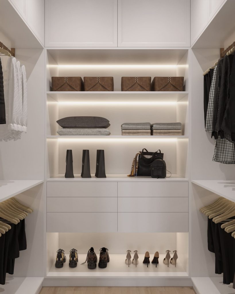 Гардеробная по просьбе заказчика сделана максимально лаконичной - все 3 стены небольшого помещения представляют собой открытые секции для хранения одежды и обуви с небольшими закрытыми вставками (выдвижные ящики в секции с полками и верхний ряд закрытых полок по всему периметру с распашными дверцами под шляпы и др.). Боковые секции хранения все оснащены штангами для вешалок с одеждой. Секции гардеробной освещены мягкой подсветкой, делающей подбор наряда более комфортным и приятным.
