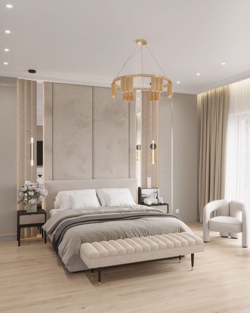 Спальня исполнена в светло-серых тонах и ее освещение проработано максимально тщательно. Естественно освещена она большим окном во всю стену, а искусственное освещение обеспечивают прикроватные светильники-бра, большая дизайнерская люстра над кроватью и точечные светильники общего типа.