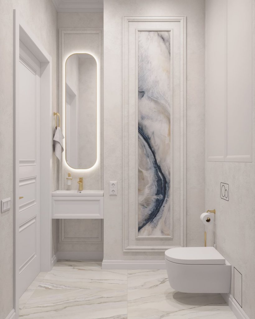 Санузел исполнен оптимально эргономично, кроме унитаза в нем - только небольшая мойка с компактной подвесной тумбой - над ней - длинное зеркало с подсветкой, создающее эффект “двойного пространства”. Пол санузла выполнен из керамогранита, который очень практичен для подобного помещения.