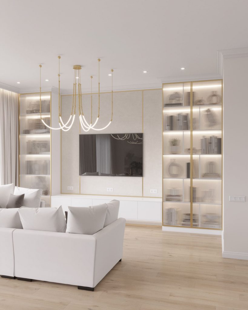 Зона отдыха отделена от остальной комнаты большим угловым диваном, на котором приятно смотреть любимые фильмы хоть вдвоем, хоть большой компанией. Также, ее дополняет ТВ панель на стене напротив, обрамленная шкафами для хранения с прозрачным рифленым стеклом, и ТВ тумбой под ней.