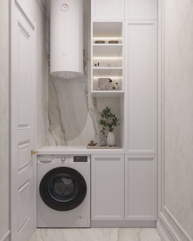 Мы учли пожелание заказчика и организовали небольшую прачечную в компактном помещении - в нем размещена только встроенная стиральная машина и и шкаф с открытыми и закрытыми секциями для хранения белья для стирки и моющих средств. Пол прачечной исполнен из керамогранита, самого оптимального для помещений аналогичного типа (с повышенной влажностью).