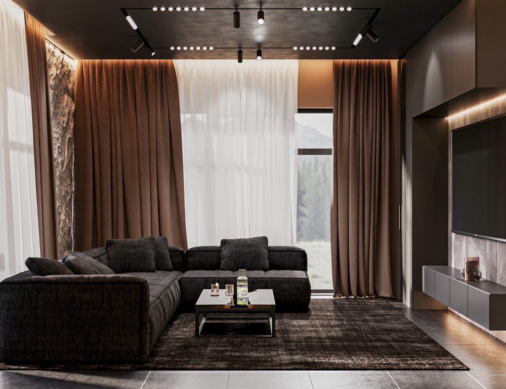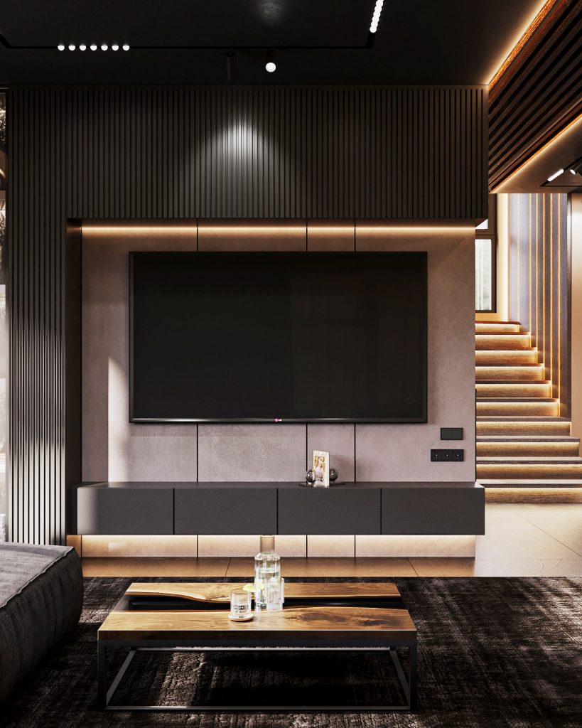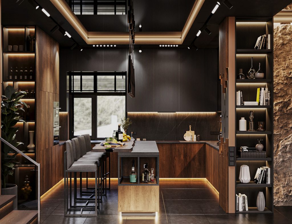 Дизайн-проект этого 3-этажного коттеджа разрабатывался для молодой пары. Особенность интерьера в том, что он весь исполнен в черных цветах, потому что так хотели заказчики. Практически во всех помещениях основной цвет - черный. Это - довольно непростая задача - создать темный интерьер, и чтобы он не выглядел подземельем. Потому, было предусмотрено много разных источников и систем освещения. Интерьер исполнен в стиле лофт, и как яркий акцент использовался в облицовке стен дикий камень. Она включает прихожую, угловую кухню-нишу, остров-барную стойку, обеденную зону, зону отдыха, систему хранения.