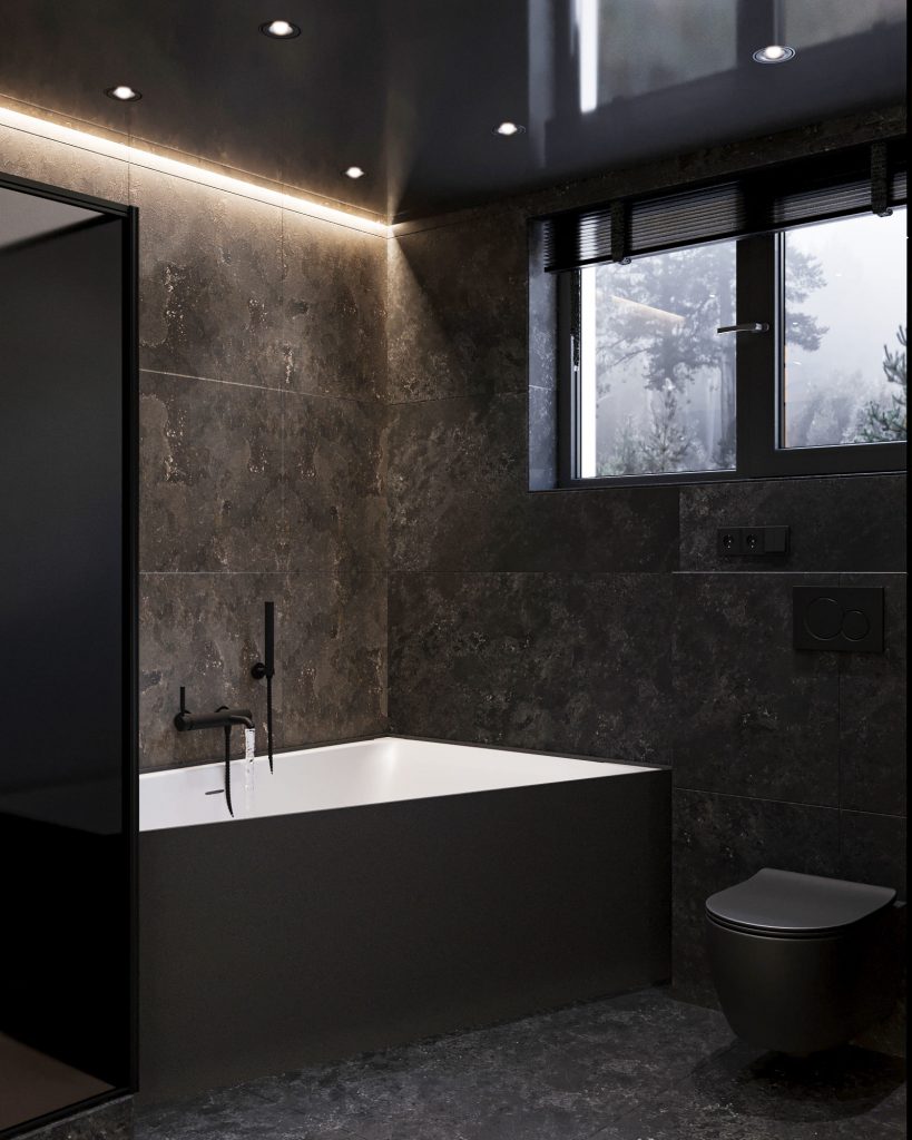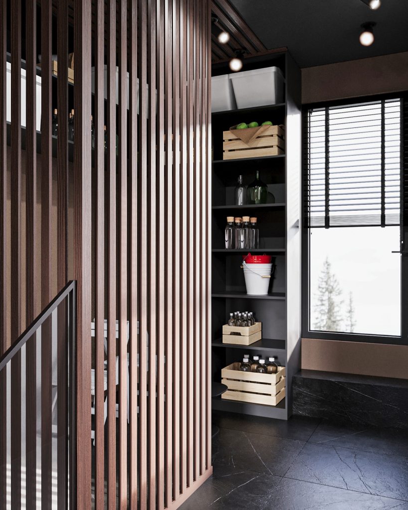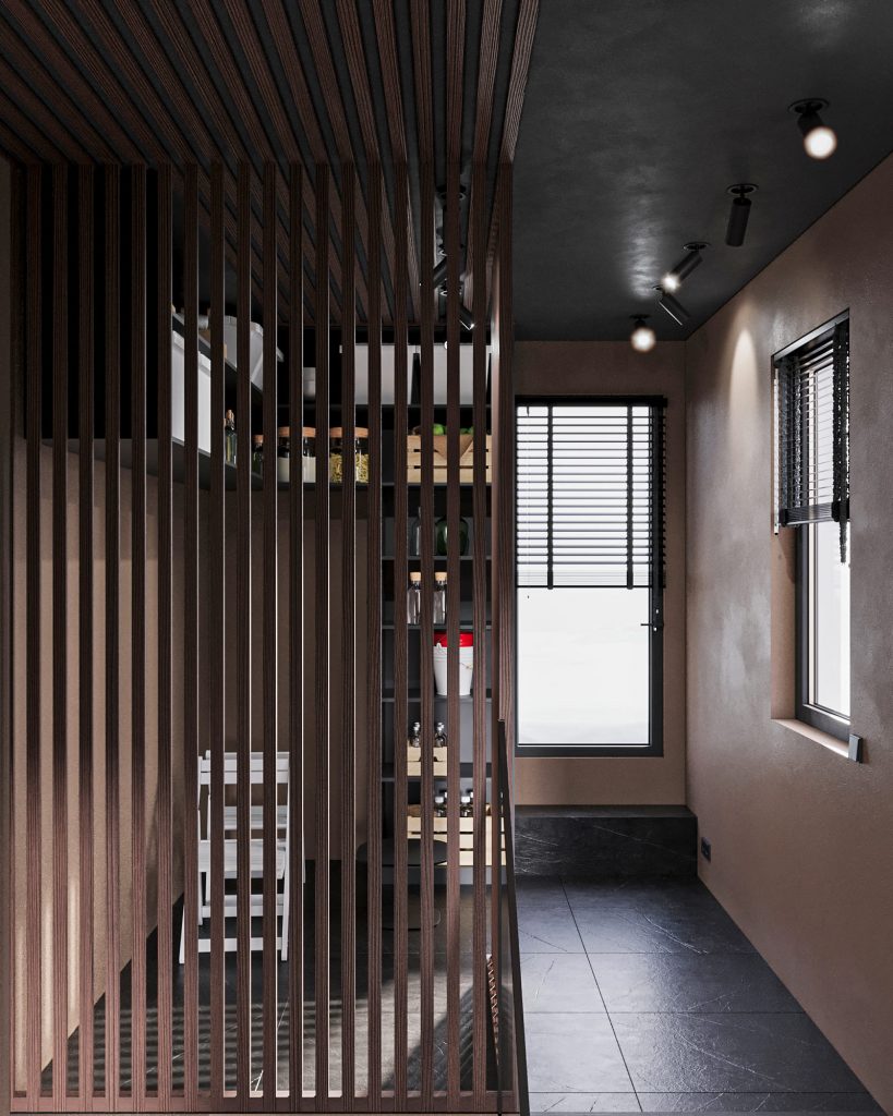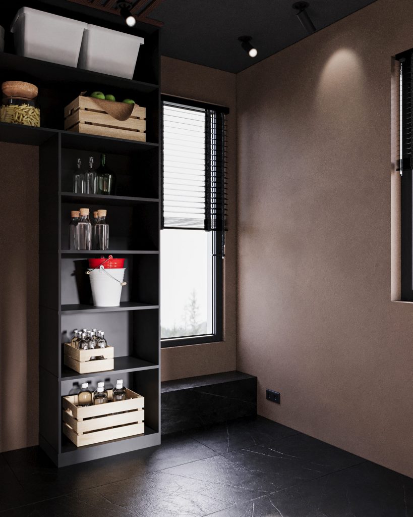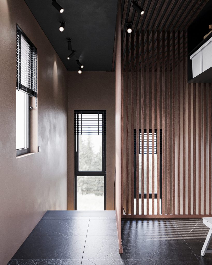 Дизайн коттеджа в черных тонах для молодой пары с прихожей, кухней-гостиной, мастер-спальней, гостевой спальней, кабинетом, гардеробной, балконом, кладовой и двумя санузлами