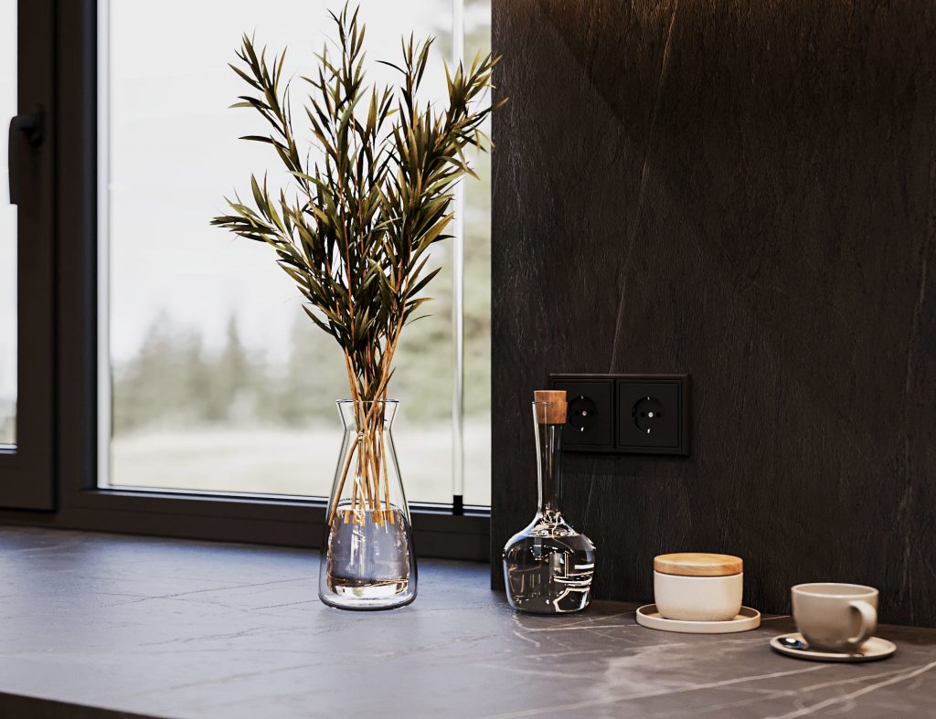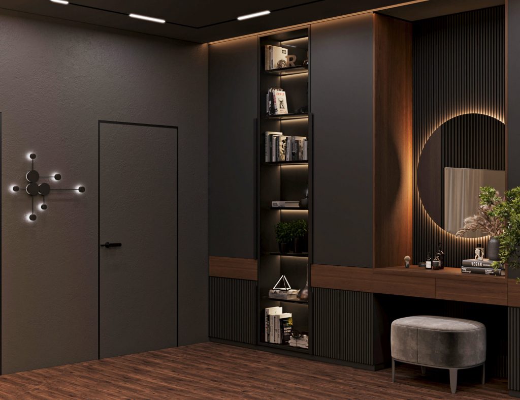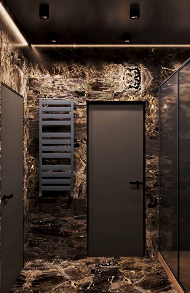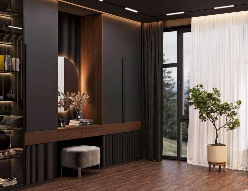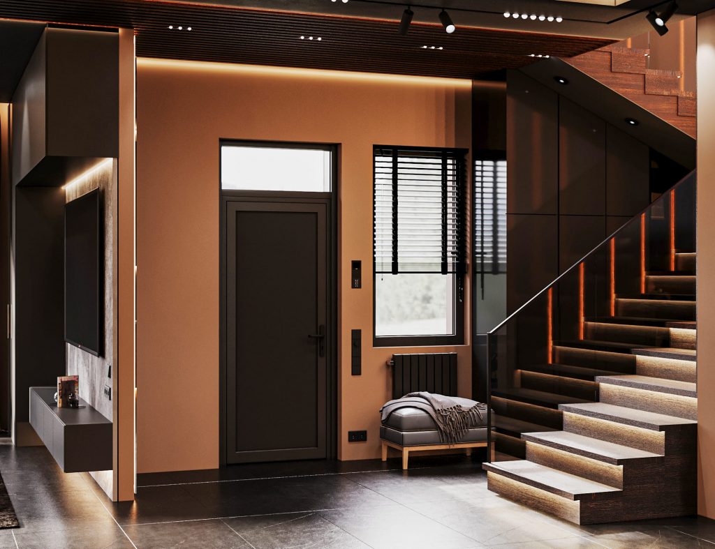Дизайн коттеджа в черных тонах для молодой пары с прихожей, кухней-гостиной, мастер-спальней, гостевой спальней, кабинетом, гардеробной, балконом, кладовой и двумя санузлами
