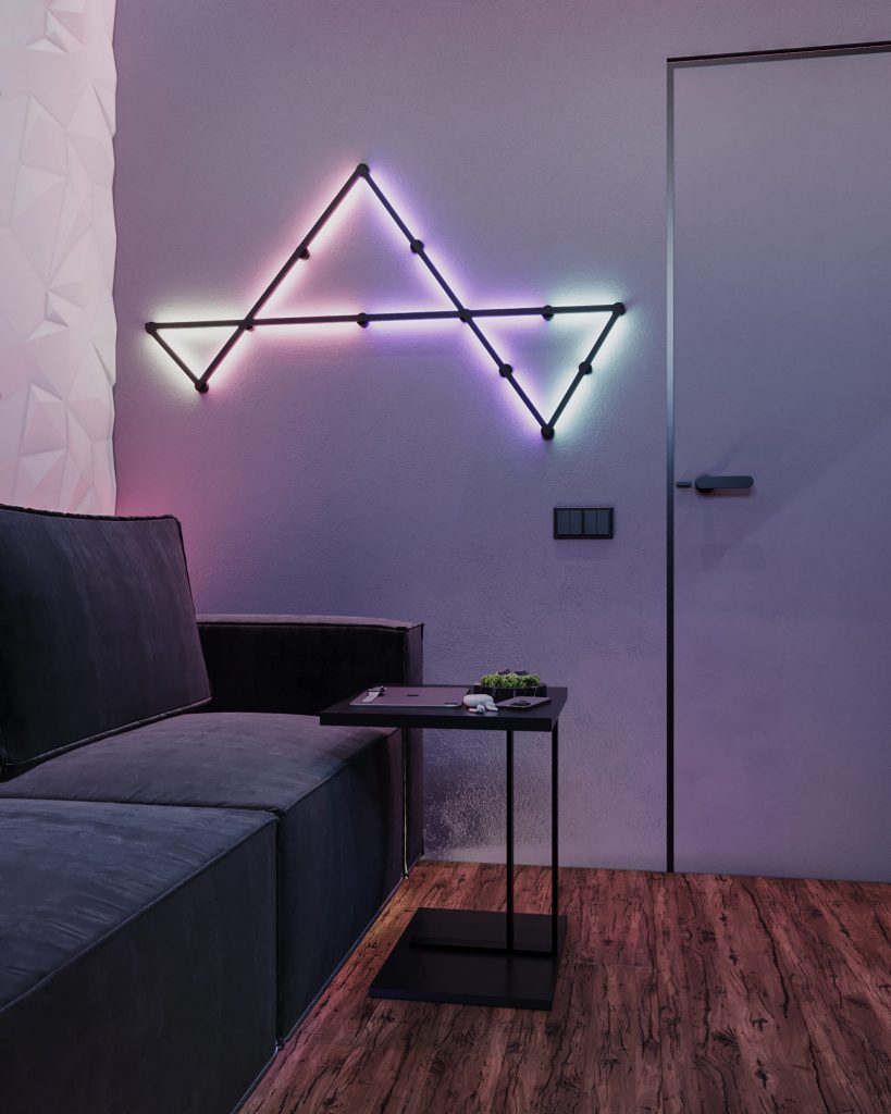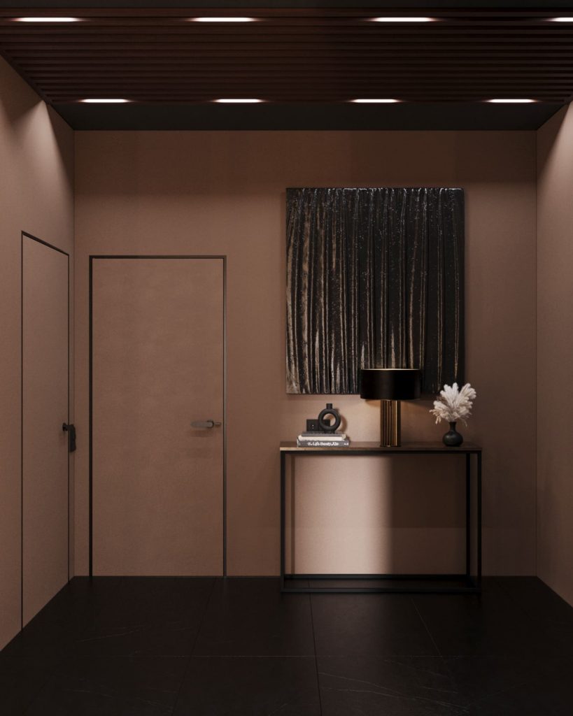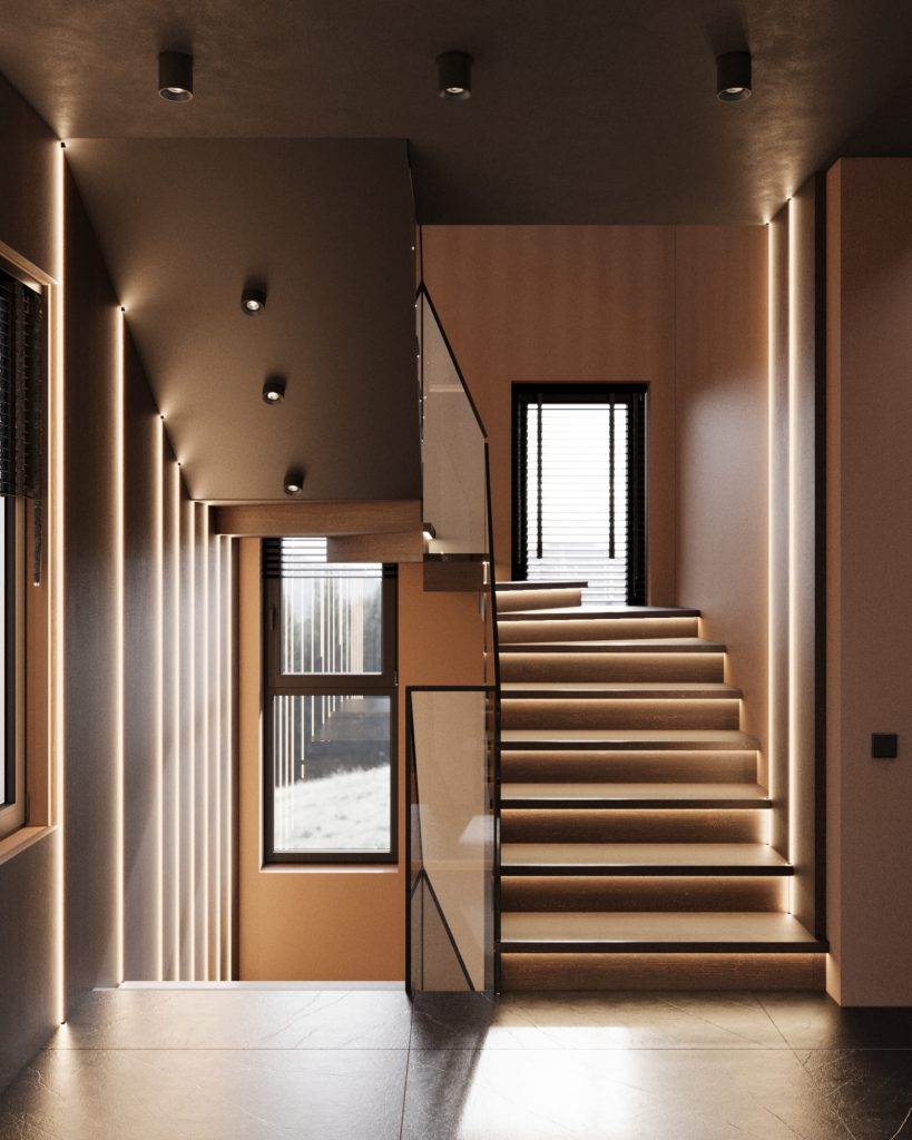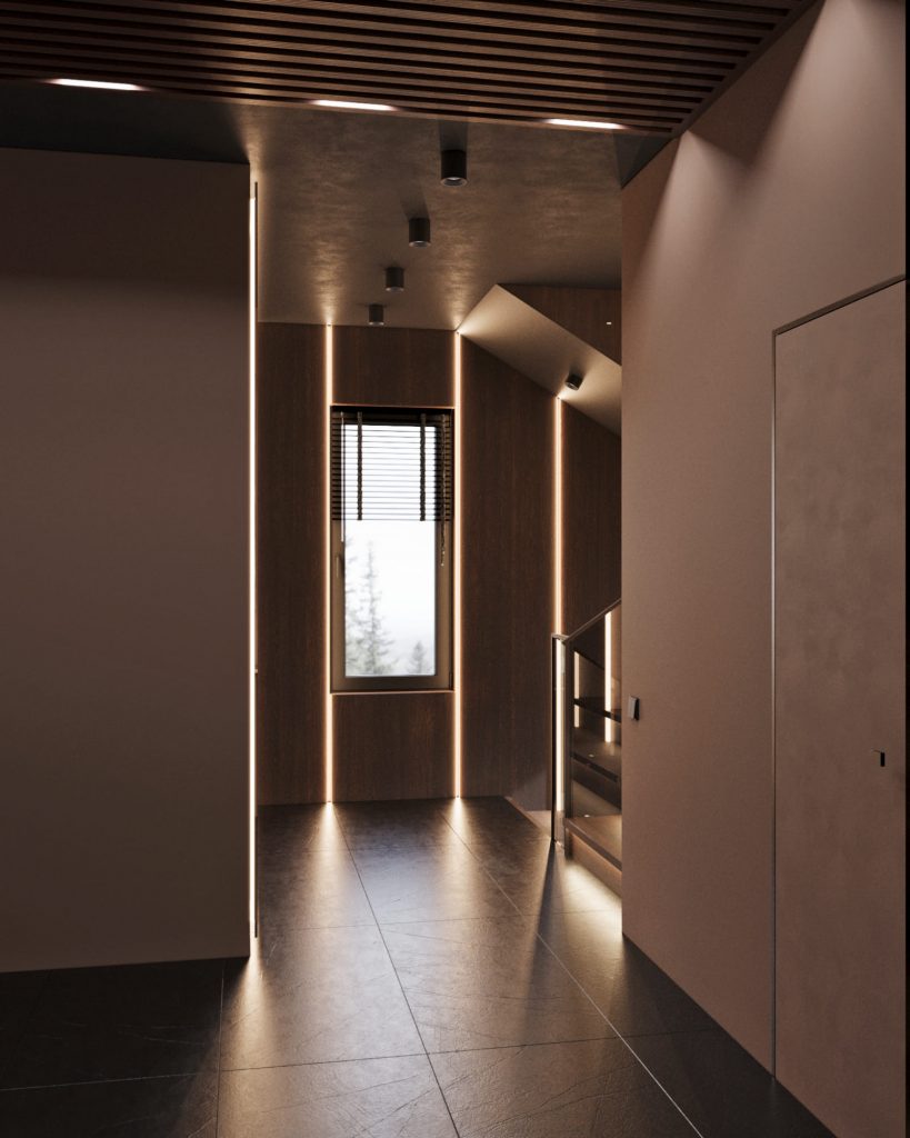 Холл оформлен крайне минималистично - в нём лишь высокий стол для книг, декоров, сувениров и огромное зеркало во всю стену, визуально расширяющее пространство. Основное освещение холла обеспечивает подсветка потолка и точечные светильники, дополнительное - настольная лампа с абажуром на столе и подсветка зеркала. Также каждая ступень лестницы украшена светодиодной подсветкой, которая активируется датчиком движения, и ступени плавно загораются одна за другой.
