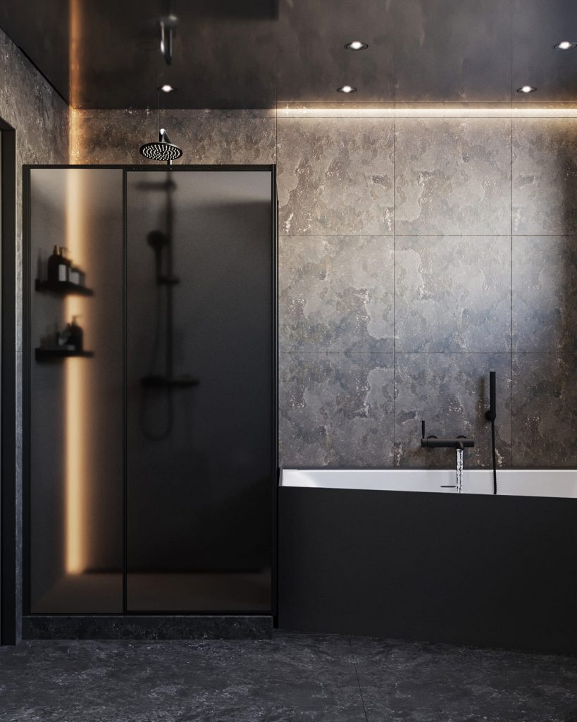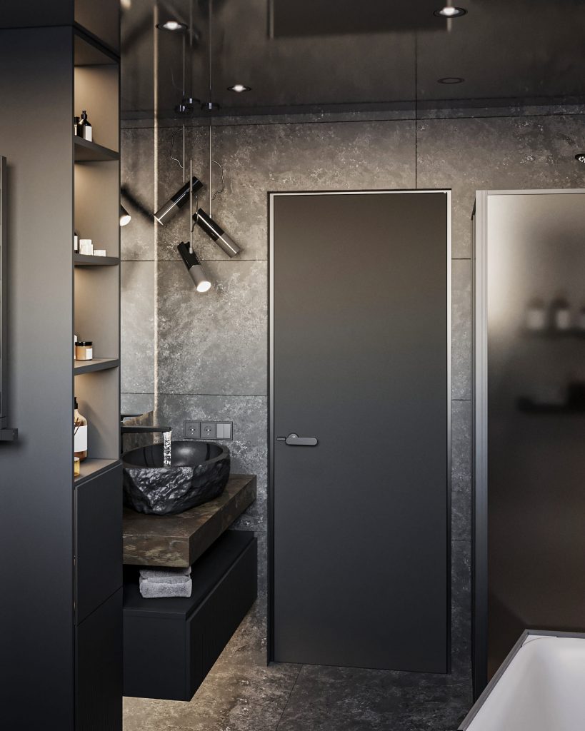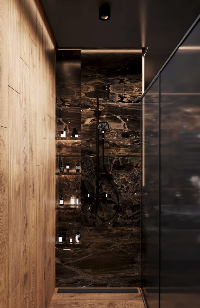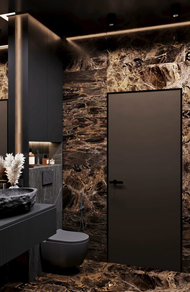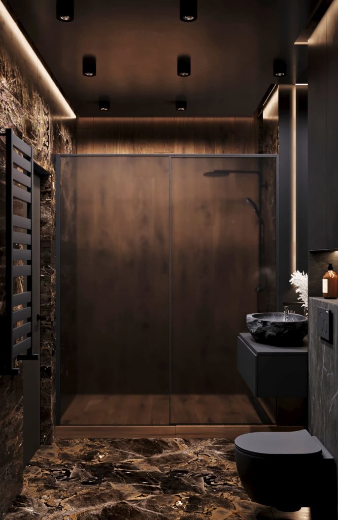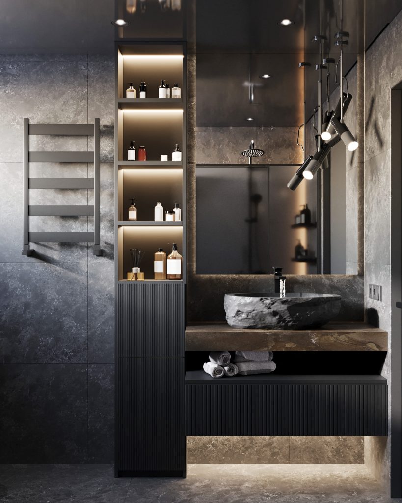 Душевая на первом этаже оформлена минималистично и функционально - здесь только душевая, раковина под необработанный камень, зеркало над ней, подвесная тумба и унитаз. Система хранения - встроенные полки-ниши в душевой и полка-ниша над унитазом. Основное освещение душевой - потолочные светильники и подсветка потолка, дополнительное - подсветка в полках-нишах и зеркала.