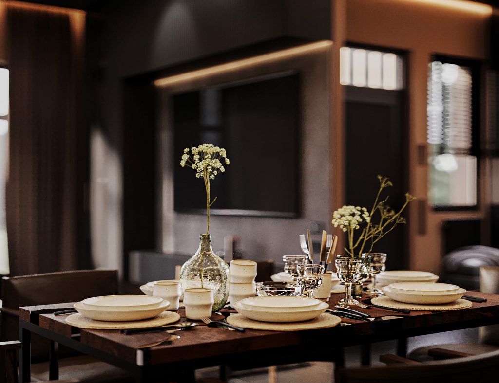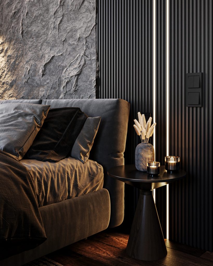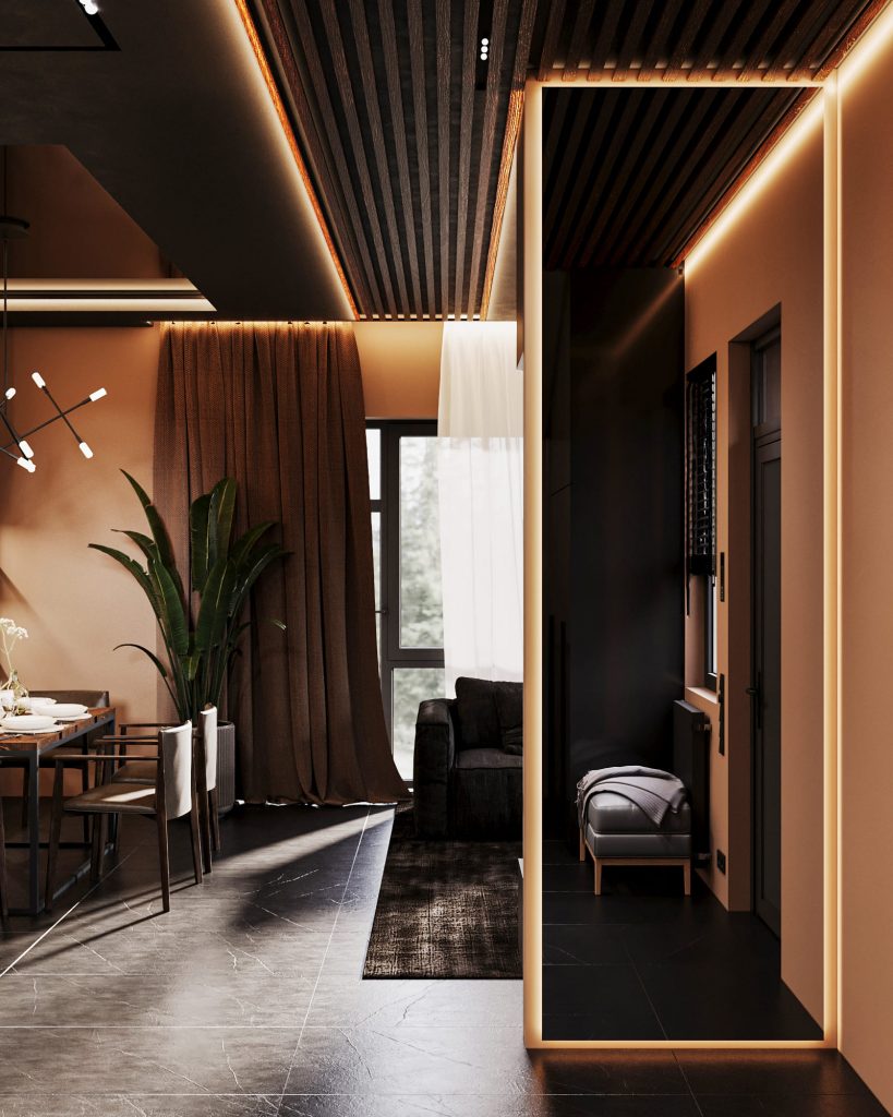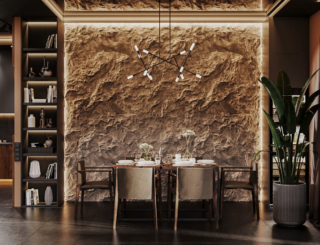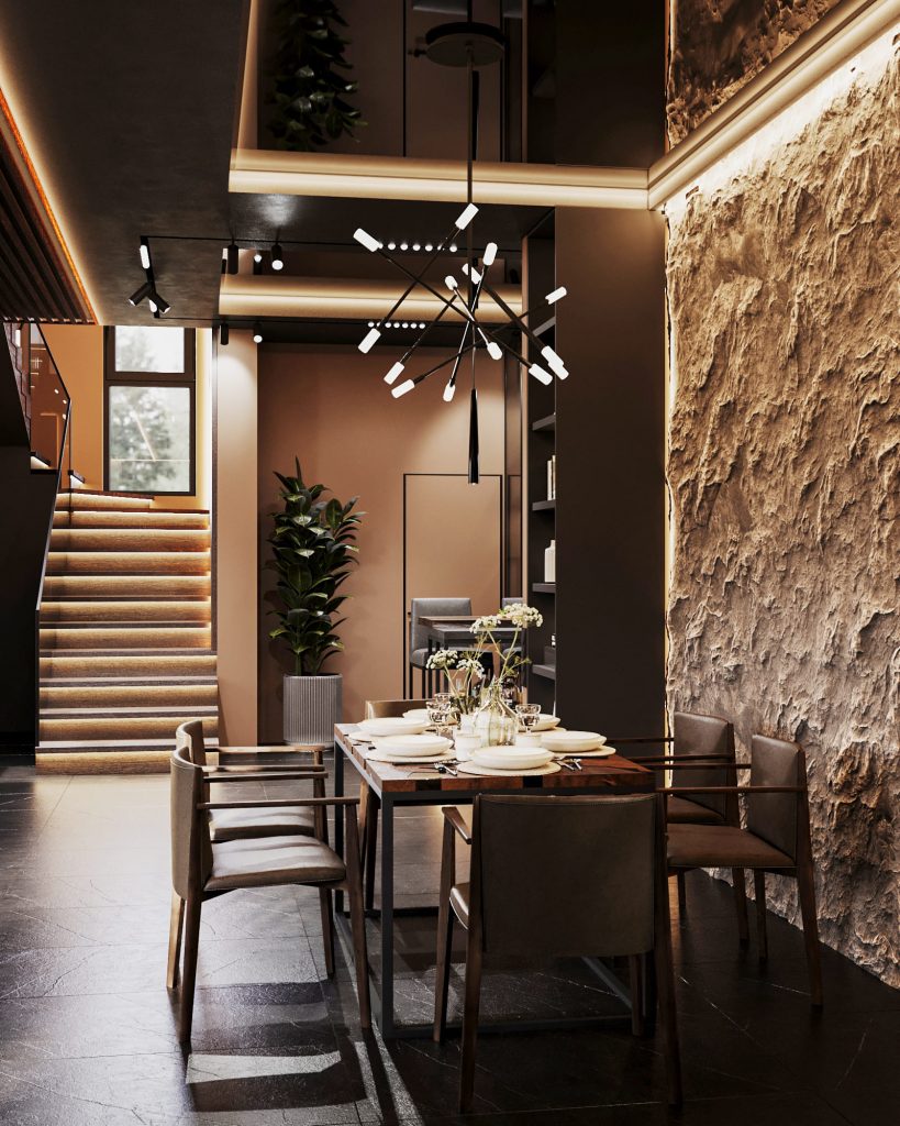 В дизайне тёмной столовой, которая является частью гостиной, выделяется стена, облицованная диким камнем. Она эффектно подсвечивается по краям, создавая ощущение движения и жизни, а также добавляя в интерьер разнообразие фактур. Глянцевый чёрный потолок над этой зоной визуально увеличивает пространство и создает эффект глубины.