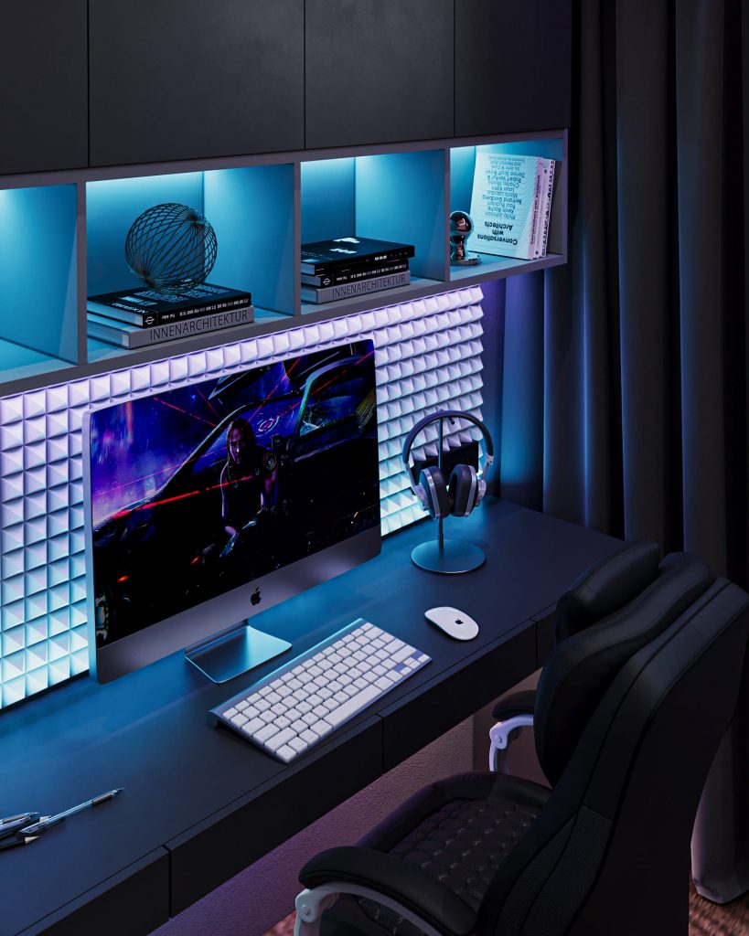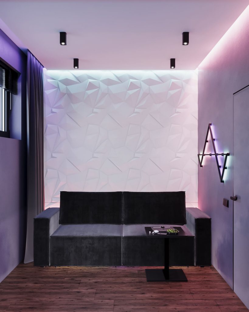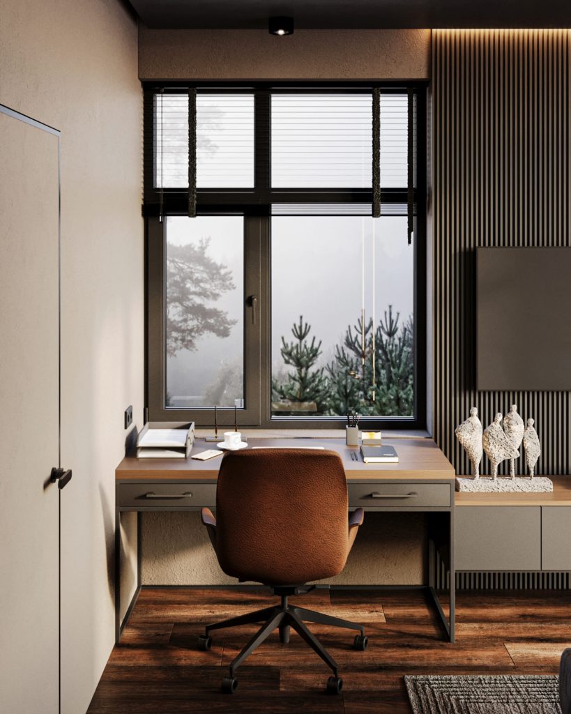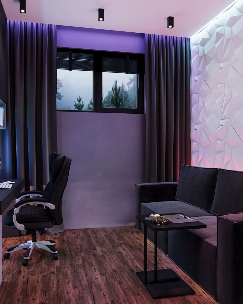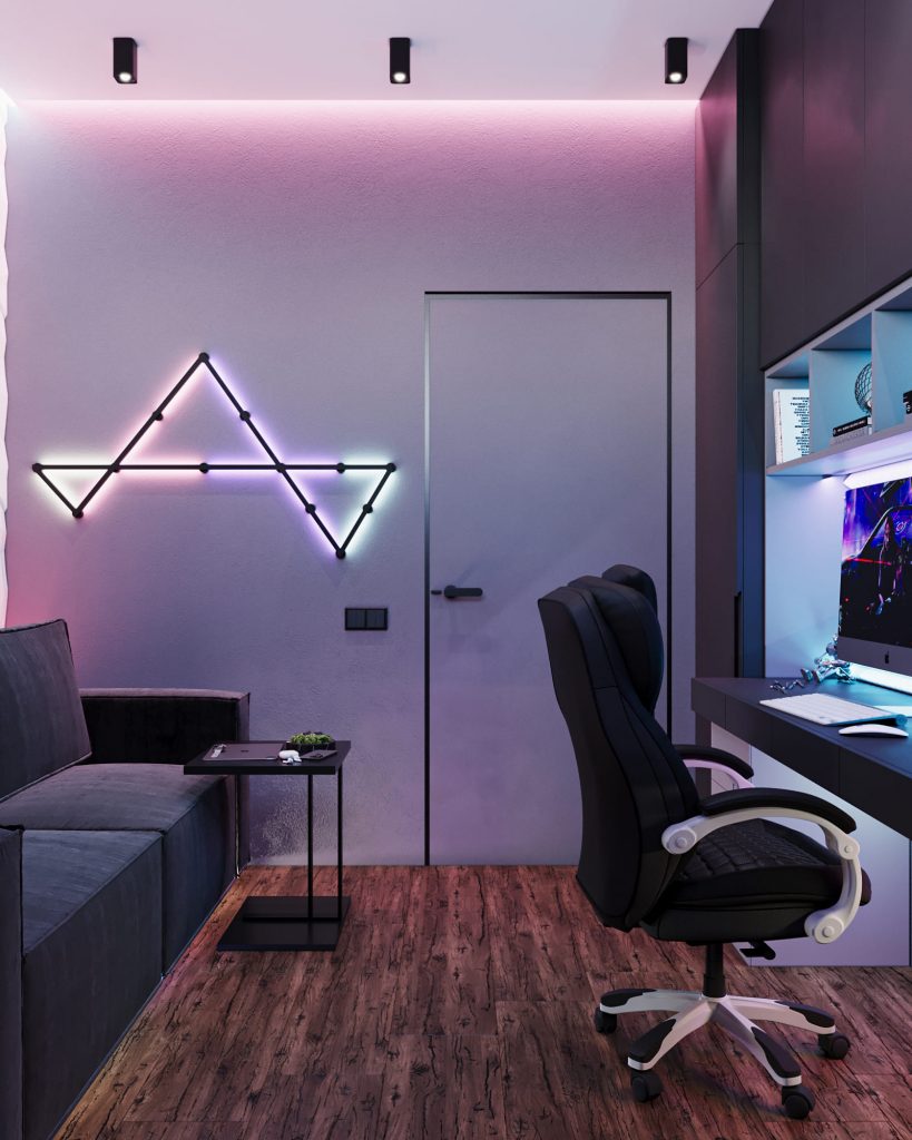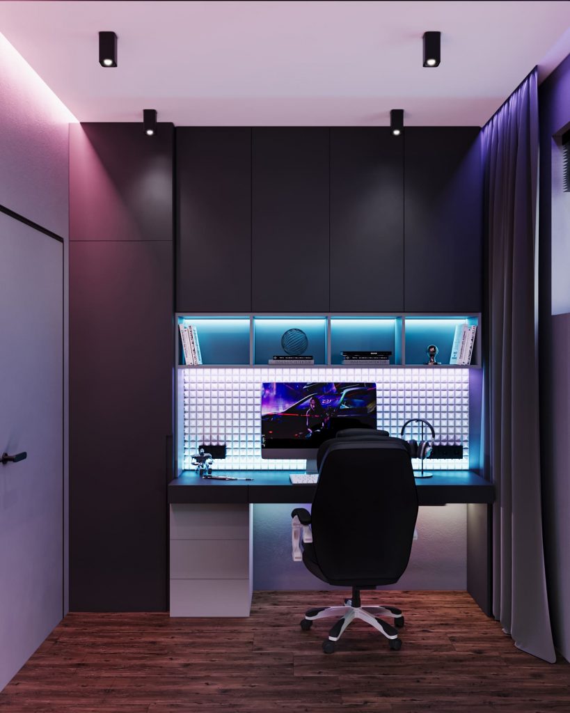 Компактный кабинет оформлен по-мужски минималистично. Он включает зоны рабочего места, отдыха, хранения. Рабочее место содержит большой компьютерный стол с выдвижными ящиками и удобное компьютерное кресло. Зона отдыха - компактный удобный диван с минималистичным журнальным столиком. Система хранения - открытые встроенные полки над компьютерным столом и модуль-шкаф около двери. Основное освещение кабинета днём обеспечивает окно, вечером - точечные светильники и подсветка потолка, дополнительное - подсветка полок и ниши над компьютерным столом и геометрический светильник-бра около входной двери.