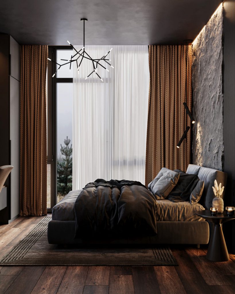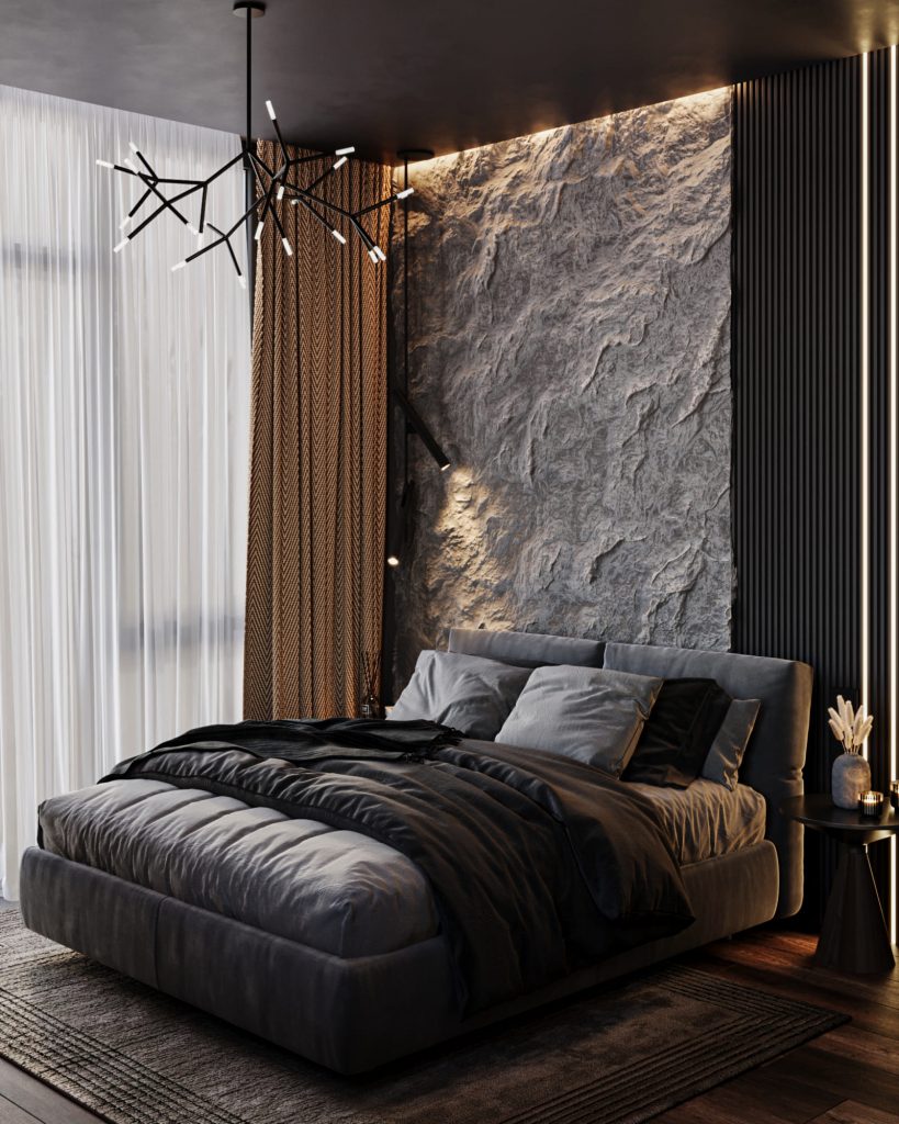 Основное освещение спальни обеспечивают днём большие окна, вечером - оригинальная люстра и точечные светильники; дополнительное - маленькие светильники на прикроватных столиках, подвесной прожектор-светильник над кроватью, подсветка над декорированной диким камнем стеной за кроватью и над декоративной панелью с ТВ-плазмой, светодиодная подсветка декоративной панели за прикроватным столиком.