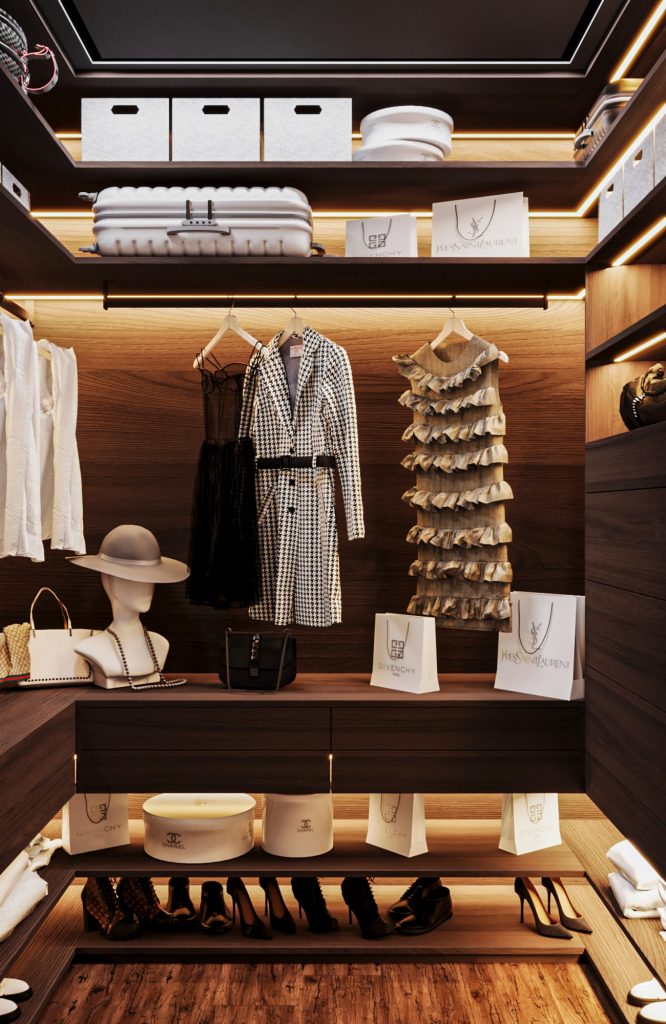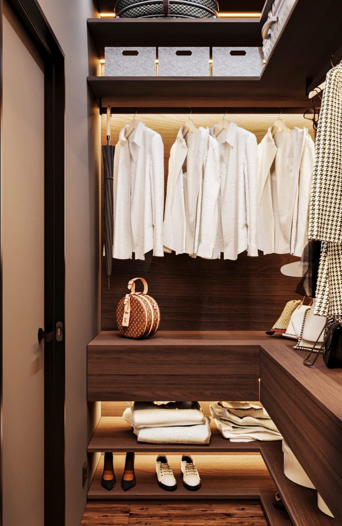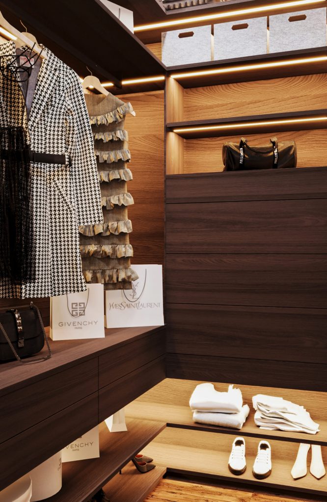 В гостевой мастер-спальне второго этажа расположена вместительная гардеробная, которая станет удобным местом для хранения одежды и аксессуаров. Гардеробная выполнена в общем стиле и цветовой гамме дома.