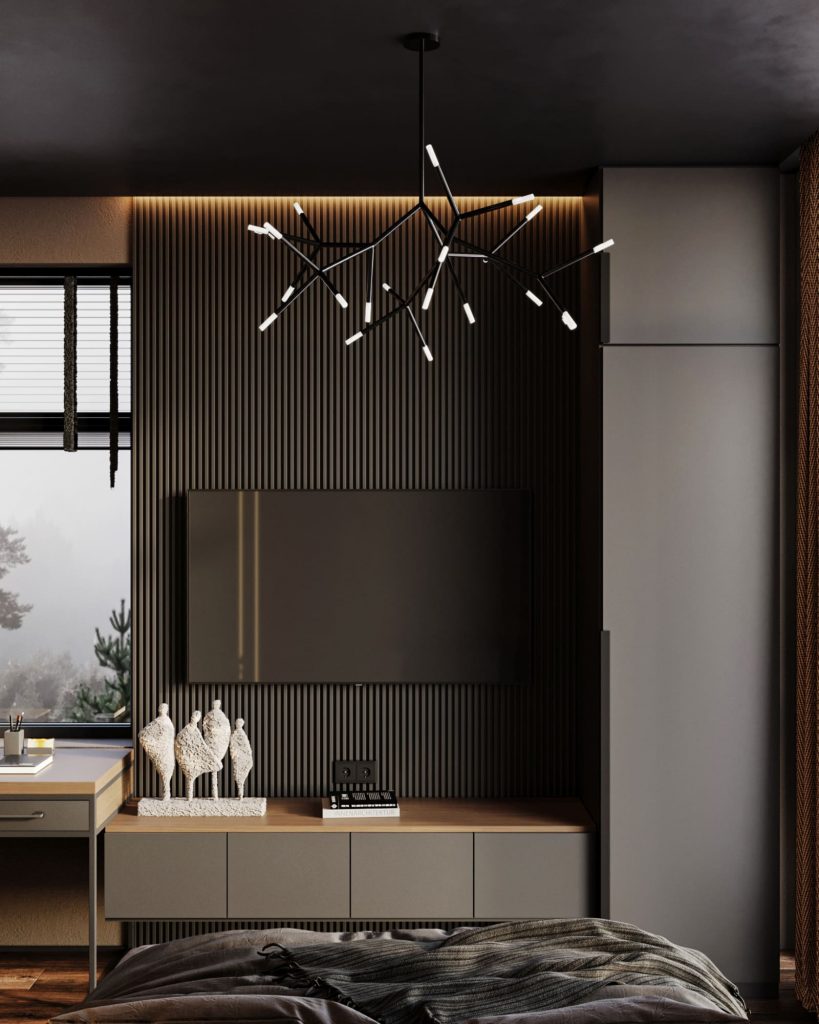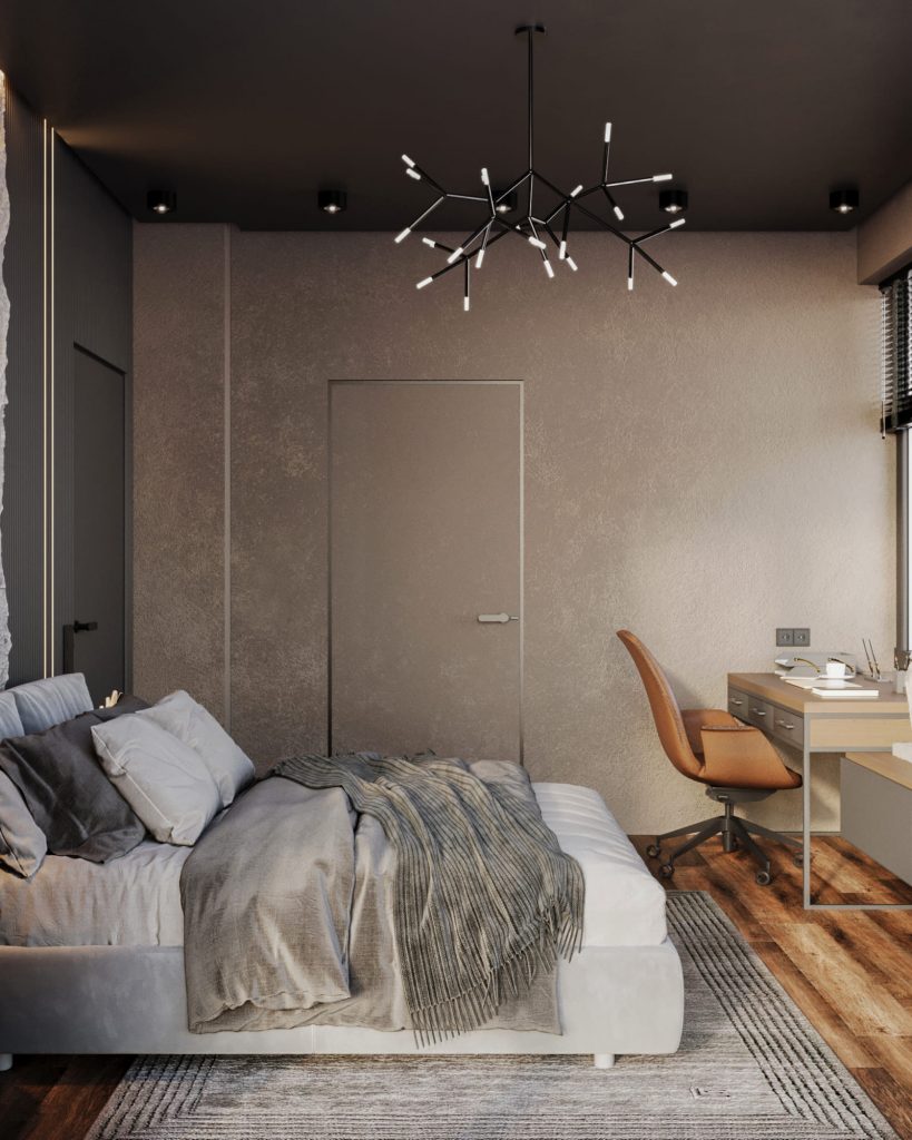 Небольшая гостевая спальня содержит зоны отдыха, рабочего места и небольшую систему хранения. Первая включает большую удобную кровать с мягким изголовьем, прикроватными круглыми столиками, ТВ панелью с подвесной ТВ тумбой. Зона рабочего места - большой компьютерный стол и удобное компьютерное кресло. Система хранения - это модуль-шкаф около окна.