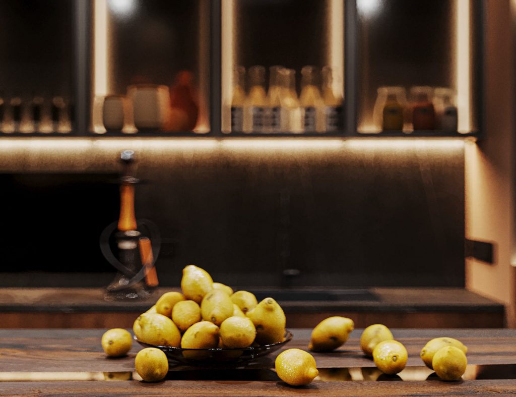 Кухня-гостиная, находящаяся на первом этаже развивает основную идею. Она включает угловую кухню-нишу, остров-барную стойку, обеденную зону, зону отдыха, систему хранения.