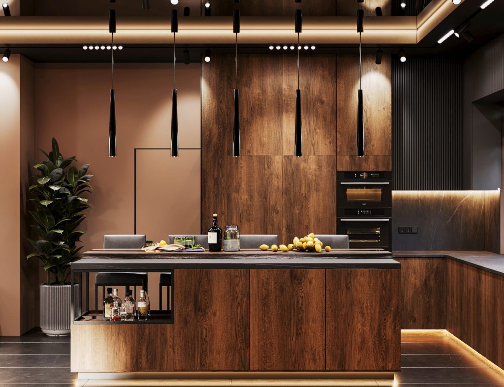 Освещение на кухне обеспечивается подсветкой: рабочей поверхности верхними модулями, верхних шкафов с посудой и напитками, нижних модулей, часов; над островом - подвесными светильниками и подсветкой нижней части; над обеденной зоной - люстрой, а за ней - подсветкой стены из дикого камня;