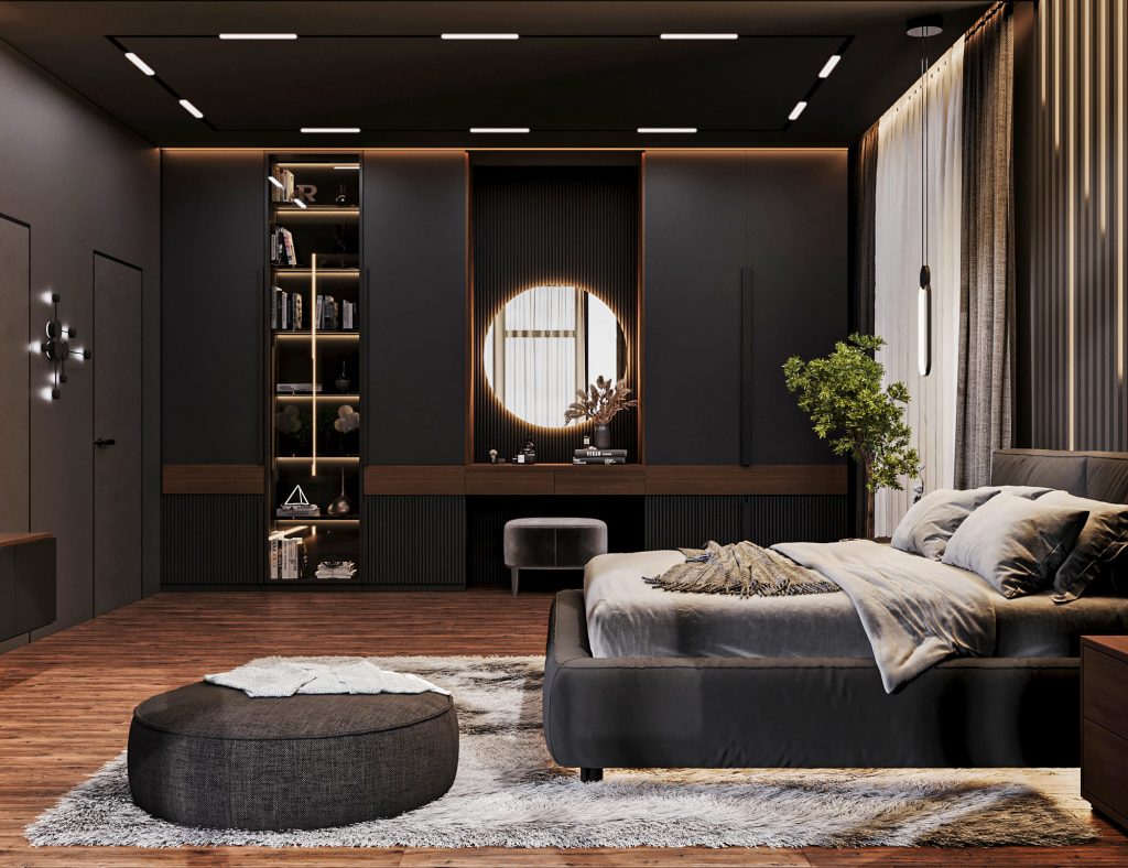 Первая представлена большой удобной кроватью с мягким изголовьем с минималистичными прикроватными тумбами, круглым огромным пуфом, громадной ТВ панелью с подвесной ТВ тумбой. Бьюти-зона включает: подвесной туалетный встроенный столик-консоль, огромное круглое зеркало, размещённые в нише, и удобный пуфик, который можно легко задвинуть под столик, когда он не нужен. Система хранения - это встроенные в нишу от пола до потолка полки для книг, сувениров и прочего.