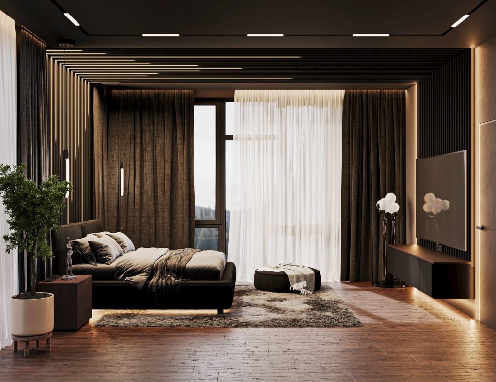 Спальня хозяев коттеджа организована по принципу мастер-спальни со своими гардеробной и балконом по их пожеланию. Она включает зону сна, бьюти-зону, систему хранения, гардеробную.