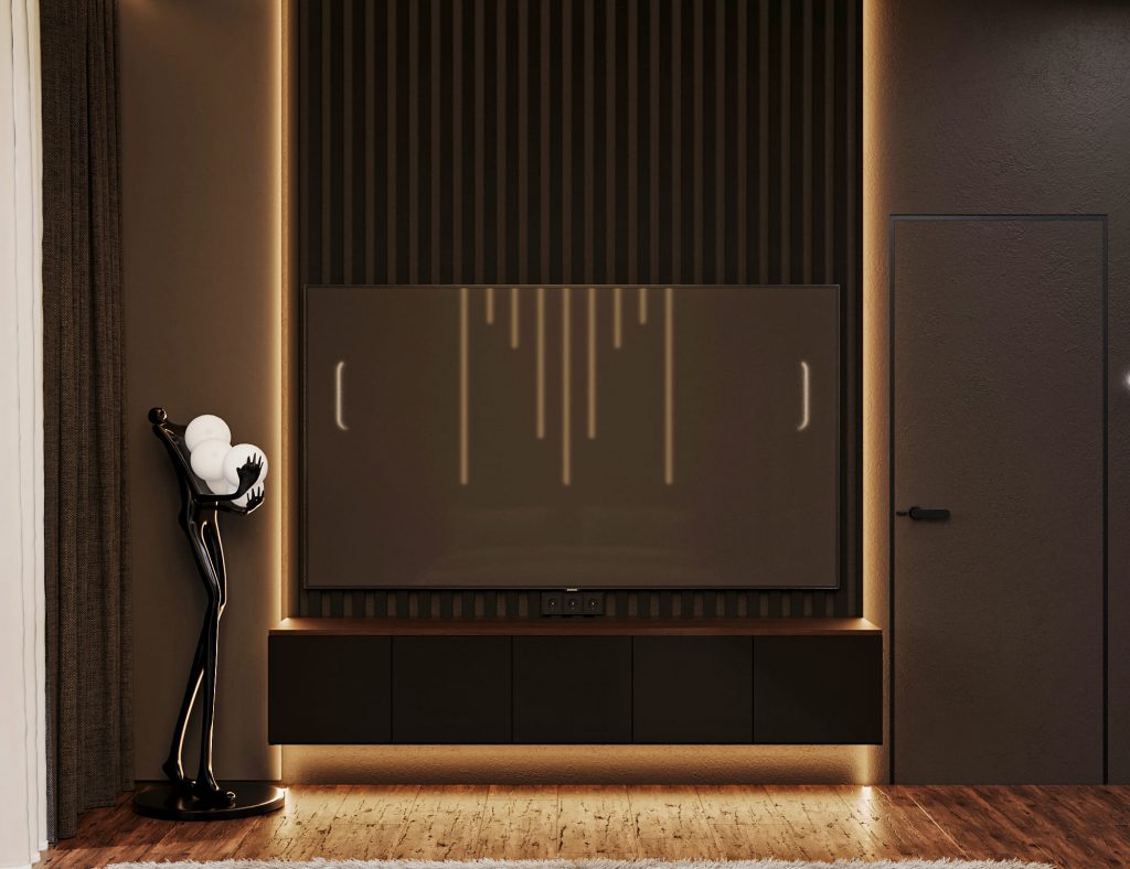 В гостиной, оформленной в стиле лофт, используются элементы дерева в тёплом оттенке. Столешница сделана из среза дерева со вставкой -выемкой из эпоксидной смолы для напитков/бокалов и огромной ТВ-панелью с подвесной ТВ тумбой. Система хранения представлена открытыми полками в торцах кухни-ниши и в модуле с открытыми и закрытыми секциями около окна (рядом с обеденной зоной).