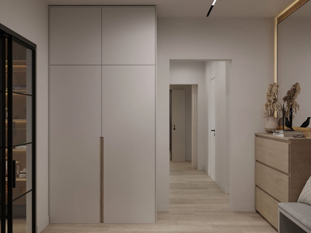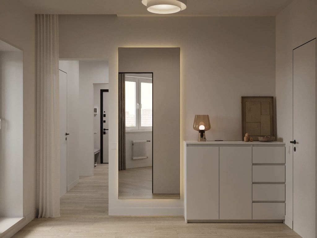 Коридор в этой квартире выполнен в минималистичном и элегантном стиле. Центральным элементом здесь является зеркало с подсветкой, которое не только выполняет свою основную функцию, но и добавляет визуальную глубину пространству. Оно идеально вписывается в интерьер, расширяя пространство и создавая приятную атмосферу. Небольшой консольный шкаф с простыми линиями и минималистичным дизайном служит для хранения вещей, одновременно не перегружая пространство.