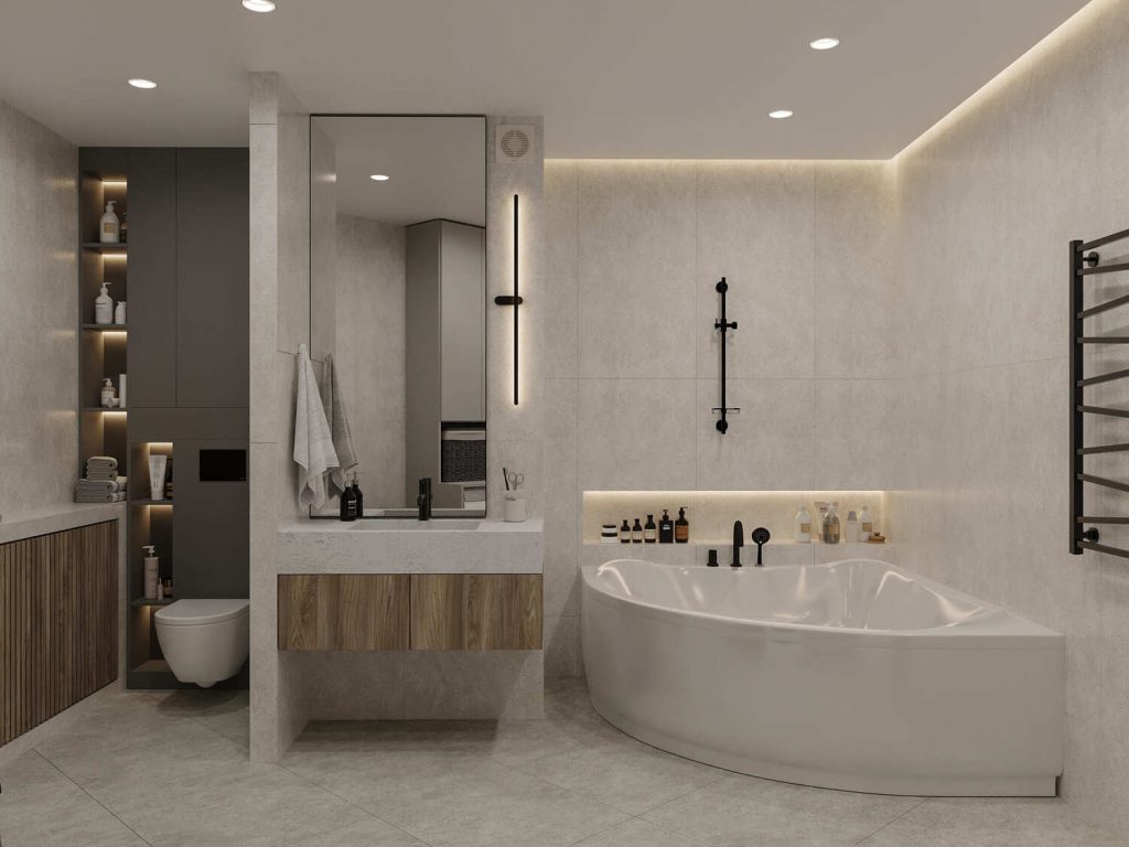 Унитаз и раковина с тумбой имеют строгие линии и продуманные детали, при этом теплые оттенки дерева в мебели привносят нотку уюта и контраста к холодной палитре плитки. Подсветка, скрытая в нишах, освещает пространство мягким, приглушенным светом, который дополняет атмосферу спокойствия и расслабления.
