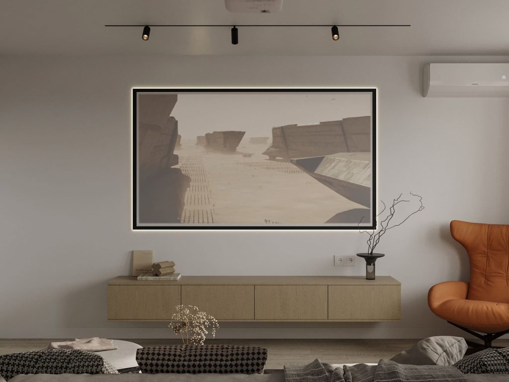Проектор, установленный на потолке, позволяет превратить одну из стен в экран для кино, создавая место для домашнего кинотеатра. Великолепные картины с текстурированным изображением и контрастные акценты на стенах дополняют общую концепцию и придают пространству элегантности и характер.