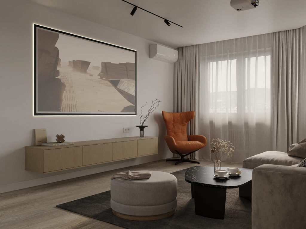 Каждая деталь в гостиной — от яркого кресла оранжевого цвета до интересных арт-объектов — подчеркивает продуманный, современный стиль, гармонично сочетая уют с функциональностью.