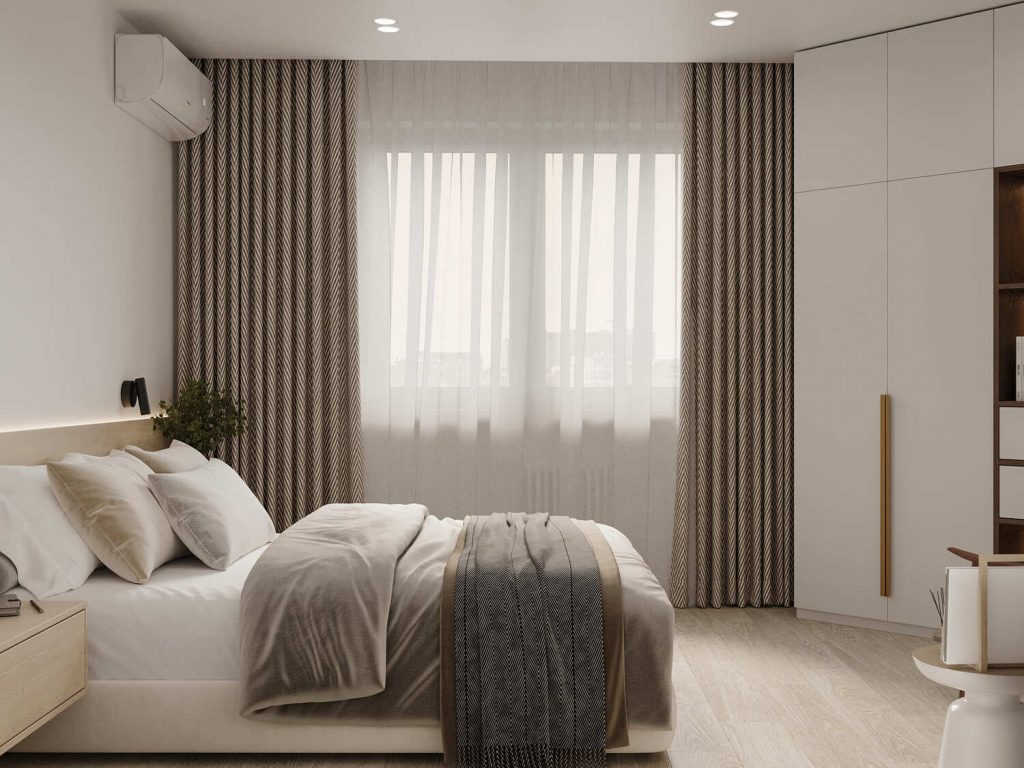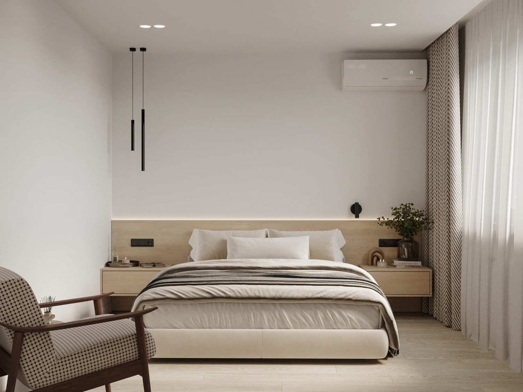 По обеим сторонам от кровати расположены элегантные прикроватные тумбочки с простыми и стильными деталями, а рядом стоит кресло в теплых тонах с характерной текстурой, которое гармонично дополняет общее пространство. Рядом с ним находится небольшой прикроватный столик с декоративными элементами, придающими уют и завершенность.