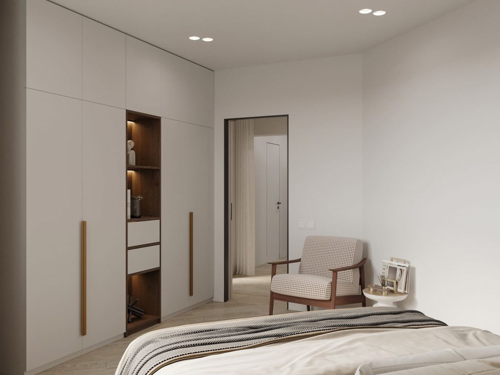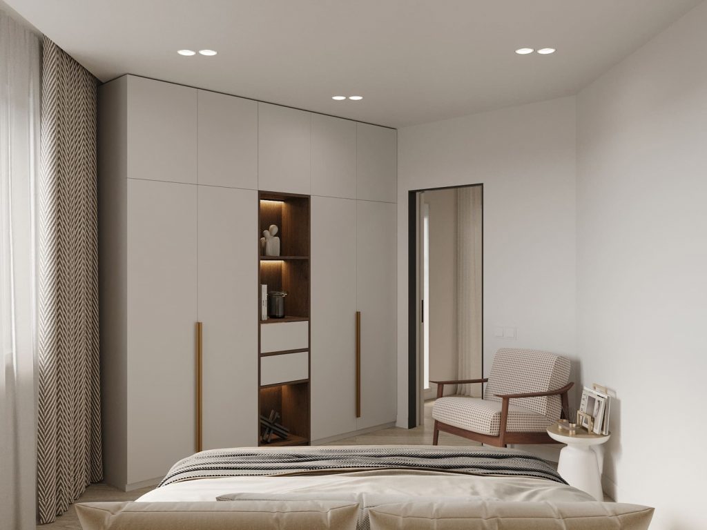 Встроенный шкаф с уникальным деревянным акцентом в центре позволяет эффективно использовать пространство, обеспечивая необходимое место для хранения. Визуально легкий, но функциональный шкаф с дополнительной подсветкой выделяет декоративные элементы и привносит в интерьер стильный акцент.