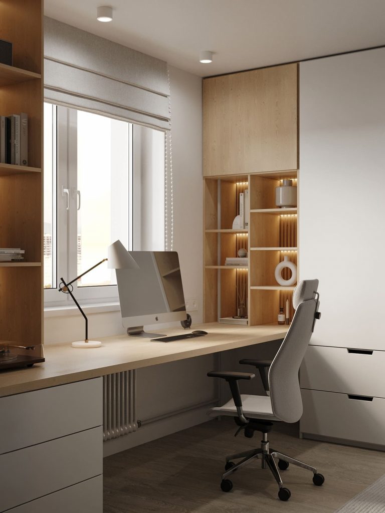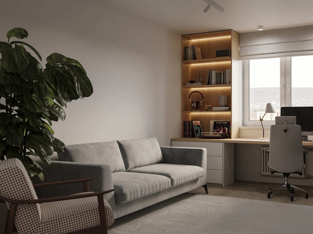 Особое внимание уделено деталям: на столе стоит стильная лампа, а в углу размещены декоративные элементы, такие как растения и книги, создающие атмосферу уюта и вдохновения. Окно, через которое в кабинет проникает естественный свет, делает пространство светлым и открытым, создавая комфортную рабочую атмосферу.