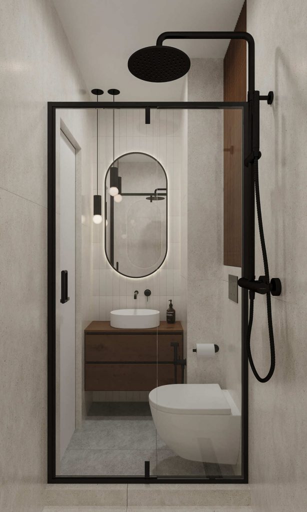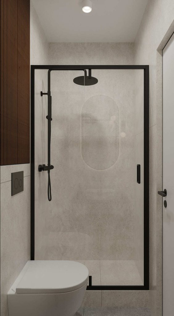 В этом санузле использован строгий и современный дизайн, который сочетает в себе функциональность и стиль. Просторная душевая зона, отделенная прозрачной стеклянной перегородкой с черной рамой, создает ощущение открытости и легкости. Чёрный смеситель и душевой набор с крупным верхним душем вносят элемент современного минимализма и утонченности, идеально гармонируя с нейтральными тонами отделки.