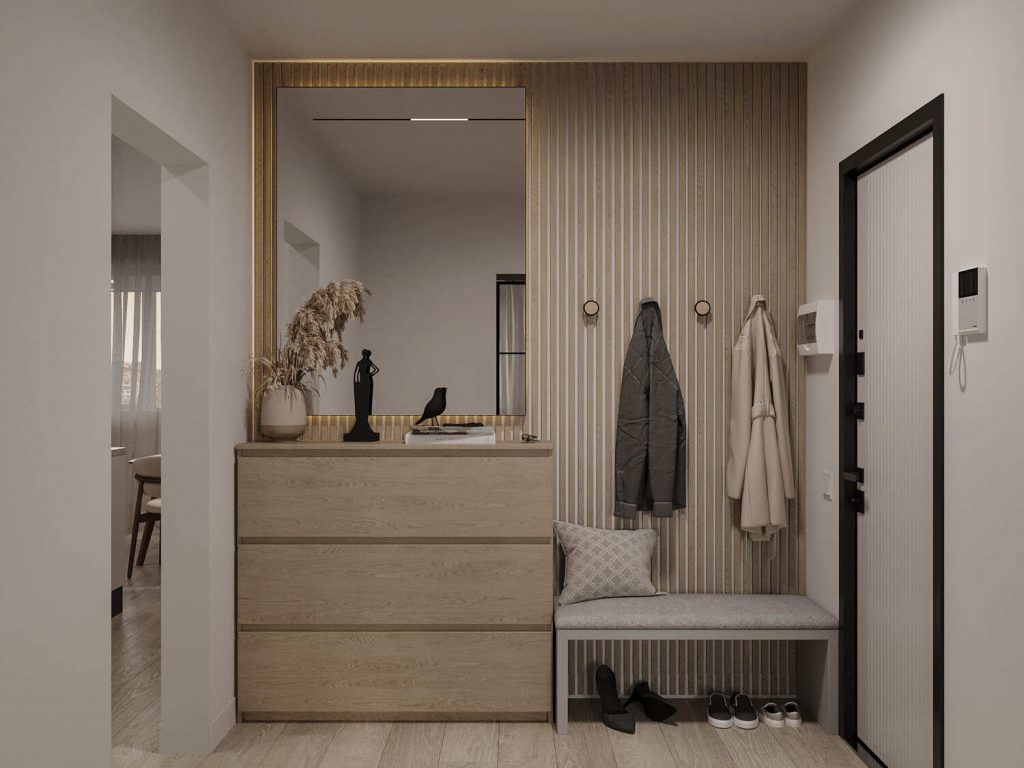 Входная зона этой квартиры создает ощущение легкости и уюта с первого шага. Простой и функциональный дизайн коридора подчеркивается сдержанными цветами и современными материалами. Стена с вертикальными текстурированными панелями добавляет интерес и глубину, а зеркало с подсветкой визуально расширяет пространство. Просторная тумба с ящиками и скамья для удобства снятия обуви делают прихожую не только стильной, но и практичной. Подсвеченные элементы и аккуратные вешалки вносят акценты в общую гармонию интерьера.