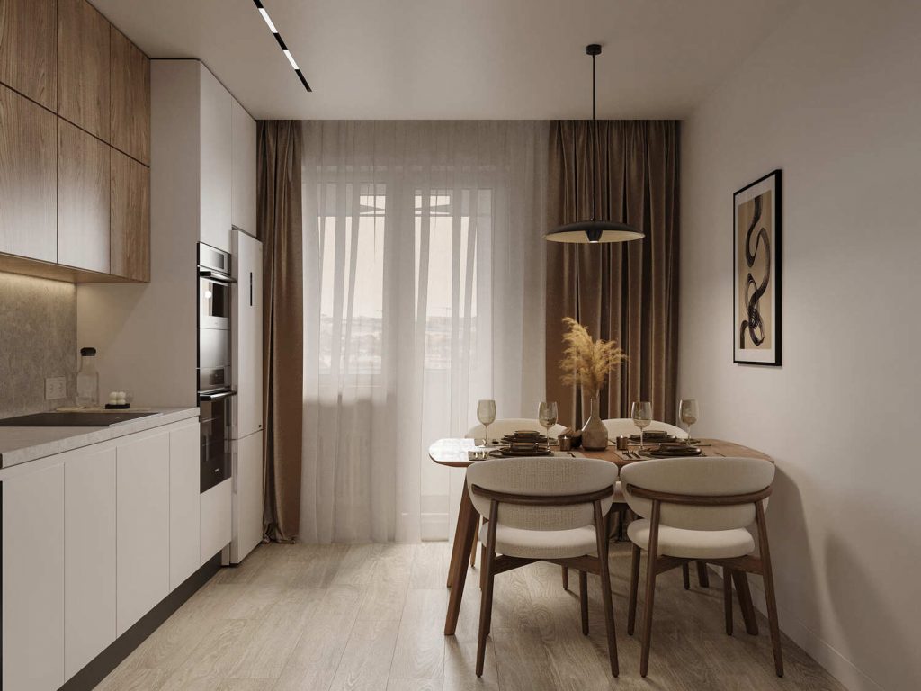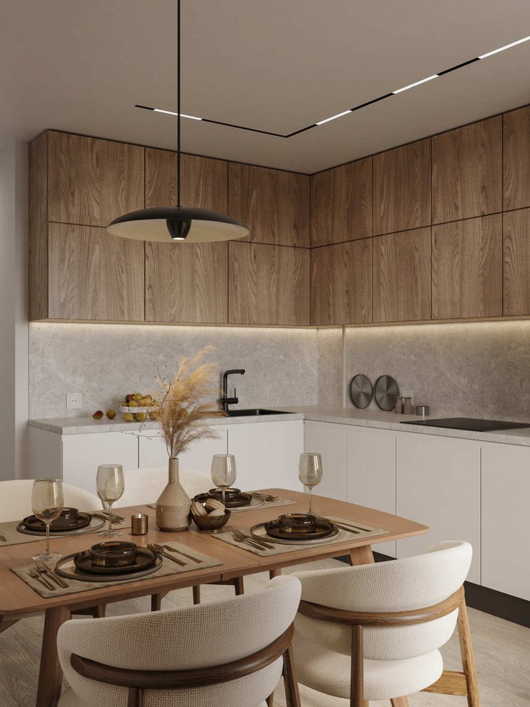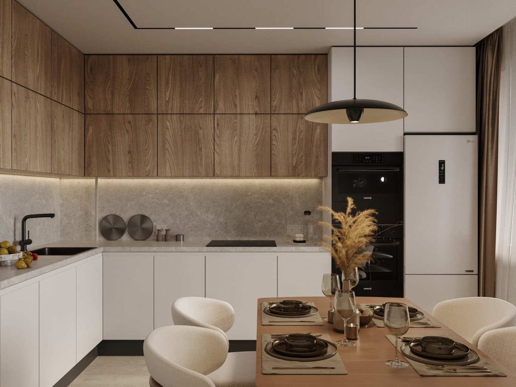 Кухня в этой квартире — это место, где встречаются элегантность и удобство, современный стиль и природные материалы. Верхние шкафы с текстурированным деревянным фасадом создают ощущение теплоты и уюта, а нижние белые шкафы в контексте светлой отделки придают пространству чистоту и современность. Сочные природные оттенки дерева идеально сочетаются с холодными, но элегантными каменными поверхностями, создавая пространство для кулинарных экспериментов и уединенных семейных вечеров.