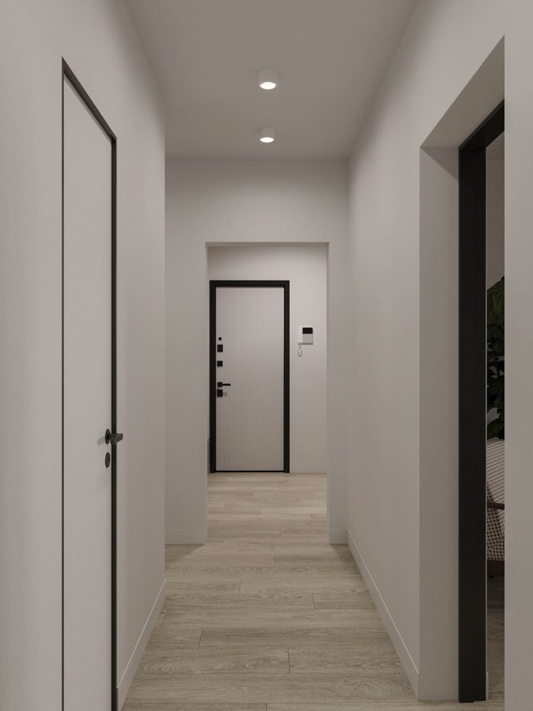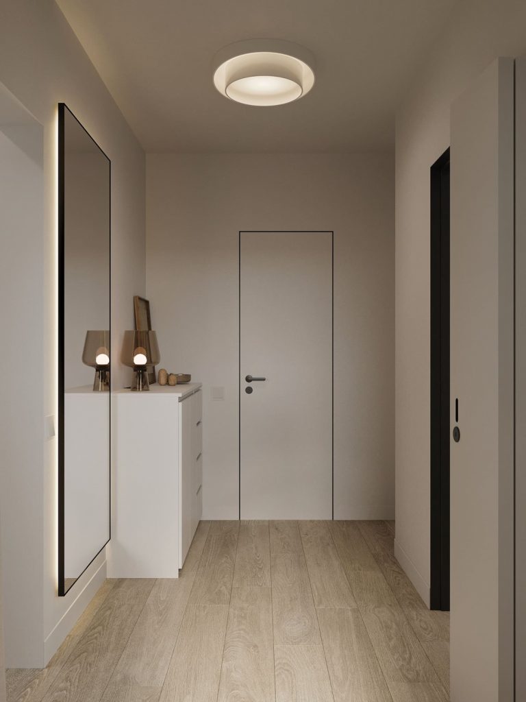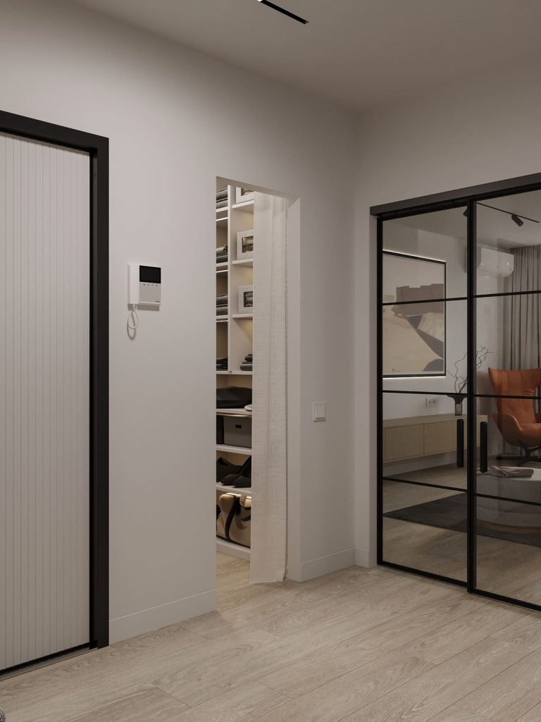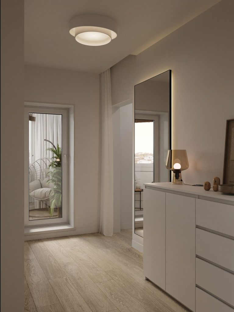 Современная потолочная лампа с мягким светом помогает создать уют, делая коридор светлым и приятным. Внимание к деталям проявляется в декоративных элементах — стильные свечи и аксессуары на шкафе придают интерьеру завершенность и теплоту. Кроме того, окно, выходящее на балкон, добавляет естественного света, при этом привнося в интерьер атмосферу уюта и свежести.