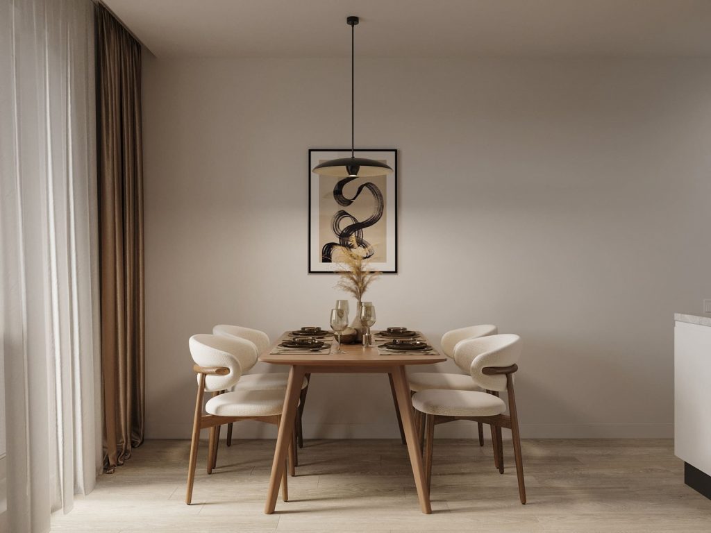 Уголок для обеденной зоны с изысканными белыми креслами и столом с деревянными элементами создает комфортное место для общения, идеально подходящее как для быстрых завтраков, так и для ужинов в кругу близких. Это пространство пропитано атмосферой расслабленности, что усиливается через внимание к деталям, таких как искусно подобранные декоративные элементы: от стильной подвесной лампы до элегантных вазочек с сухоцветами на столе.