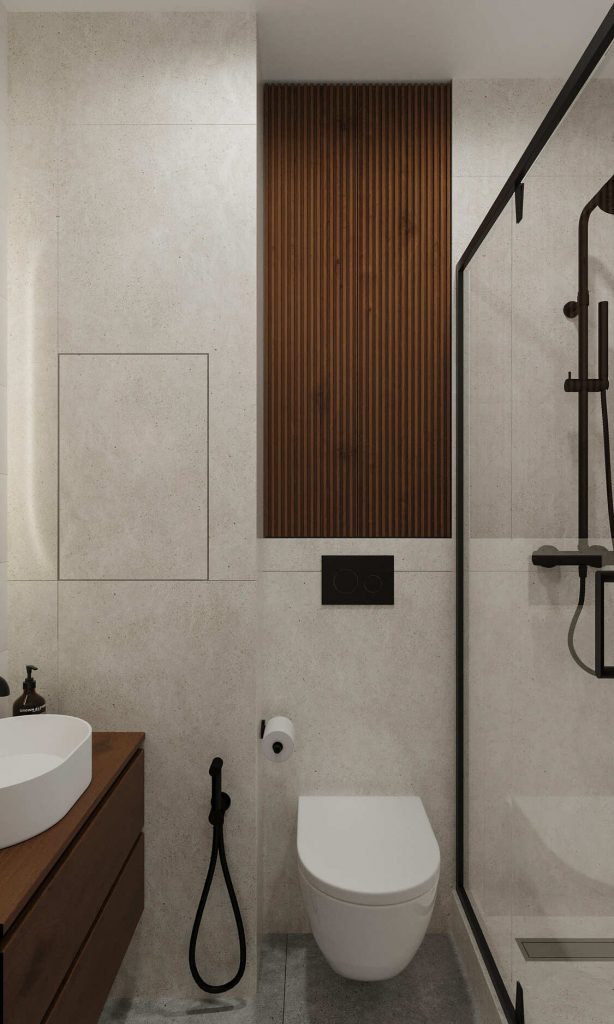 Текстурированные стеновые панели с вертикальными линиями добавляют интересный акцент и визуально увеличивают пространство, а современный дизайн отделки делает санузел стильным и функциональным.