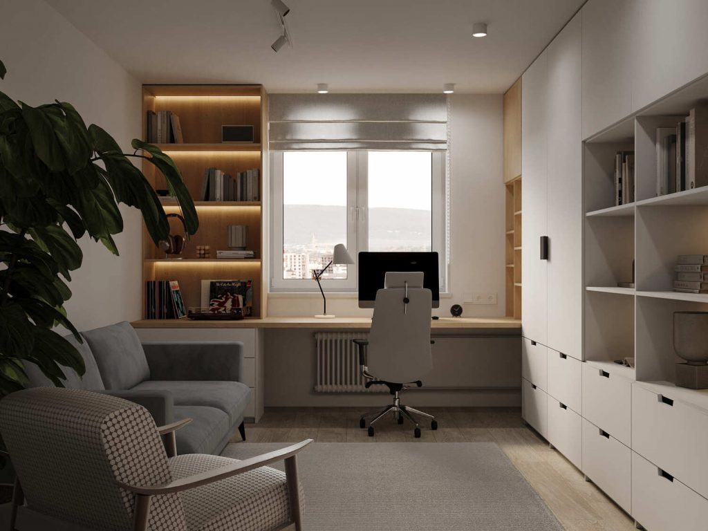 Кабинет в этой квартире — это продуманное и стильное пространство, которое сочетает в себе функциональность и комфорт. Рабочая зона с большим столом и удобным креслом создаёт идеальные условия для работы. Подсветка, установленная в открытых полках, не только помогает организовать пространство, но и придаёт уют и атмосферу расслабленности. Современные полки и шкафы с гладкими фасадами позволяют хранить книги, документы и аксессуары, поддерживая порядок и минимализм.
