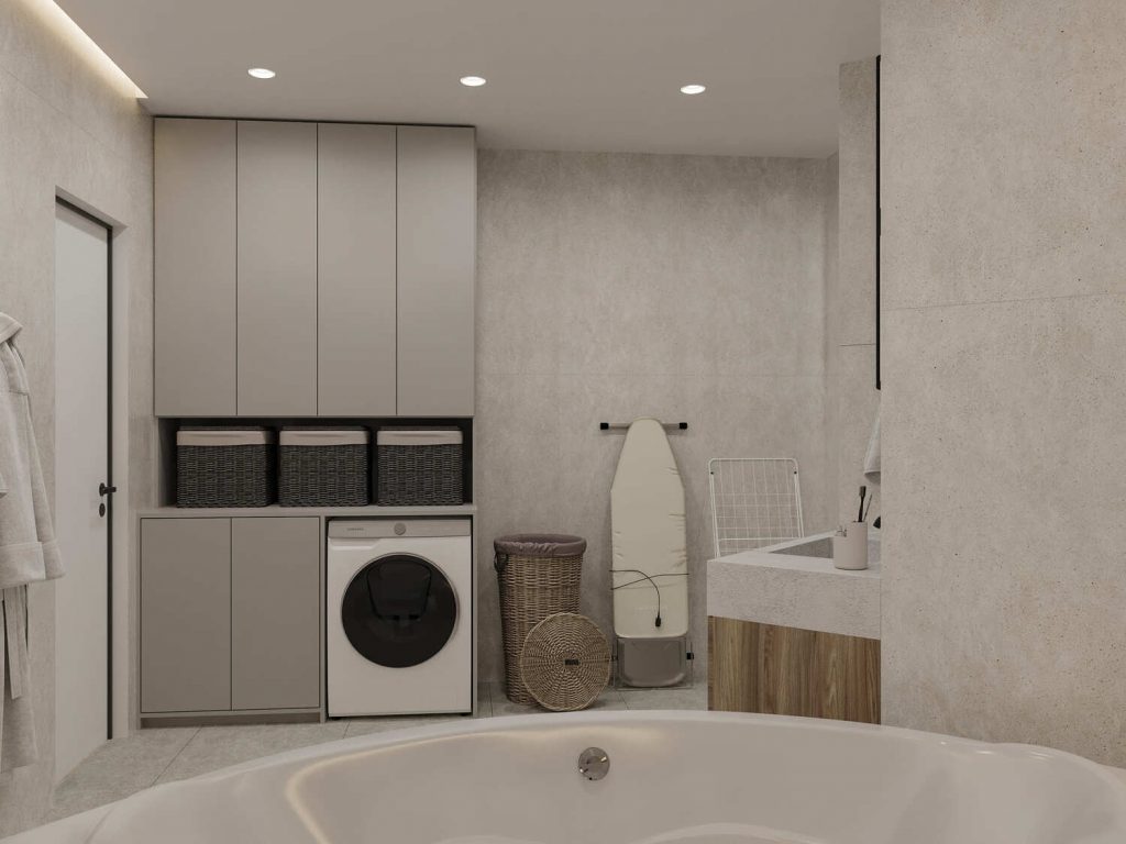 Этот современный дизайн квартиры идеально подходит для молодого человека, который в будущем планирует расширение семьи. Просторная гостиная с зоной для отдыха и просмотра кино на проекторе, уютная спальня с большой ванной и функциональная ванная комната с постирочной зоной — всё спроектировано с учётом максимального удобства. Сохранённая планировка квартиры идеально сочетается с небольшими изменениями, такими как расширение гостевого санузла. Цветовая гамма спокойных оттенков с яркими акцентами создаёт гармоничное и стильное пространство, которое отражает индивидуальность хозяина квартиры и его стиль жизни.