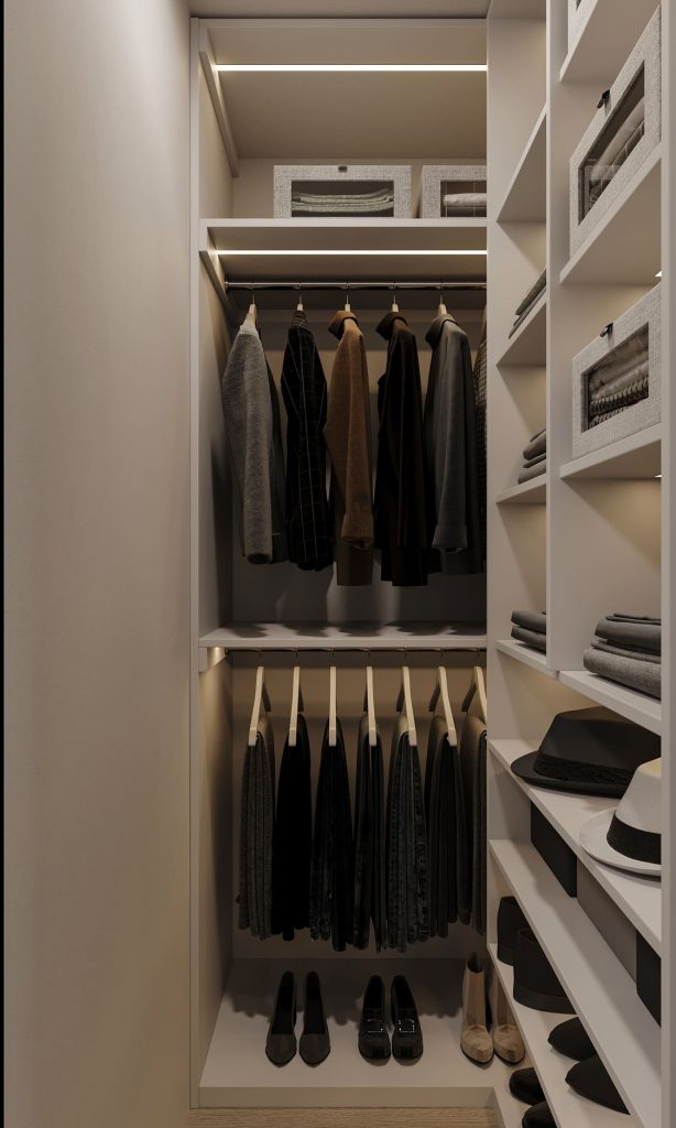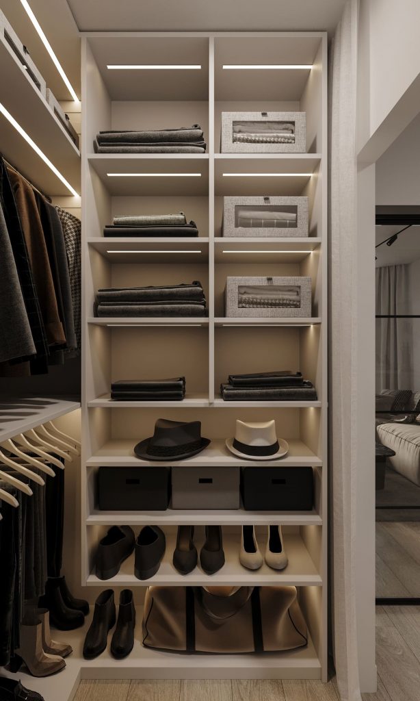 Гардеробная выполнена в современном и функциональном стиле, где каждый элемент пространства имеет свою роль. Удобные полки с подсветкой идеально подходят для хранения одежды, обуви и аксессуаров, создавая при этом ощущение порядка и легкости. Стеллажи разделены на несколько секций, что позволяет легко организовать пространство для хранения разных вещей. Подсветка в нишах добавляет атмосферу уюта и визуально выделяет элементы, не перегружая пространство.