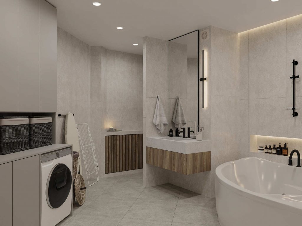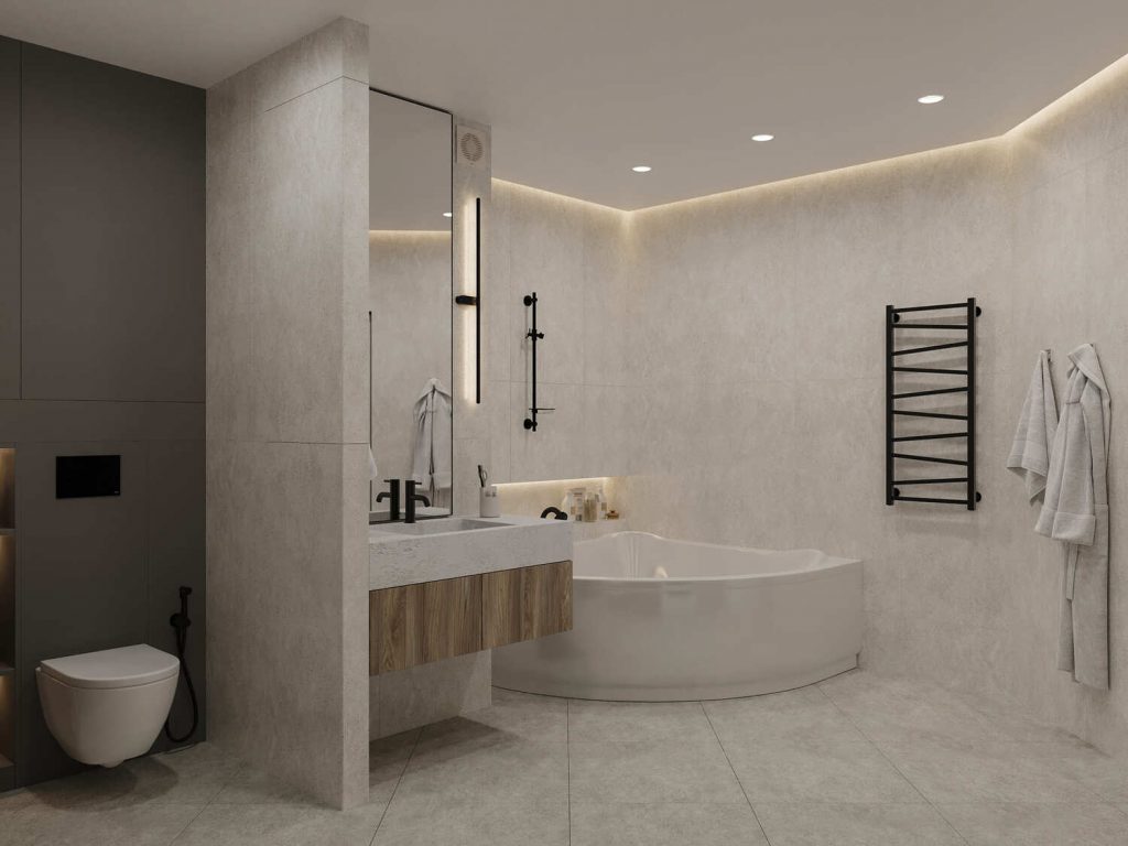 Просторная ванна с округлой формой, выполненная из глянцевого материала, является центральным элементом, создавая атмосферу уюта и спокойствия. Модный черный смеситель и аксессуары контрастируют с светлым интерьером, добавляя нотку элегантности и современности.