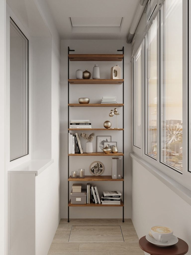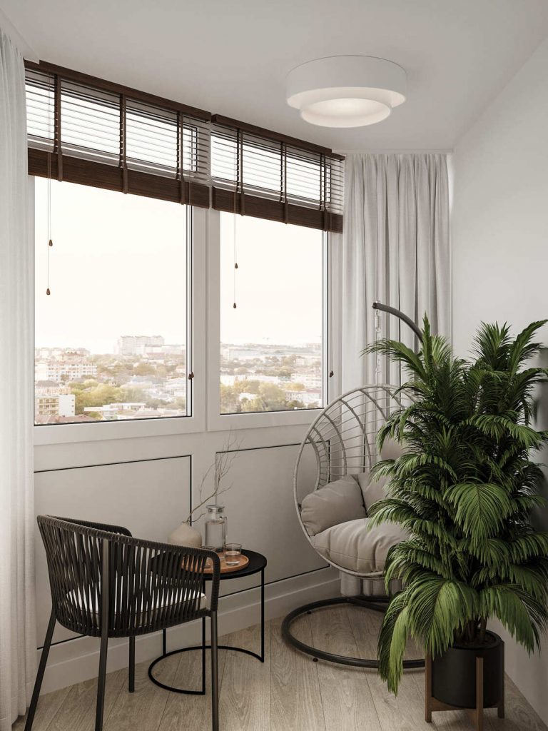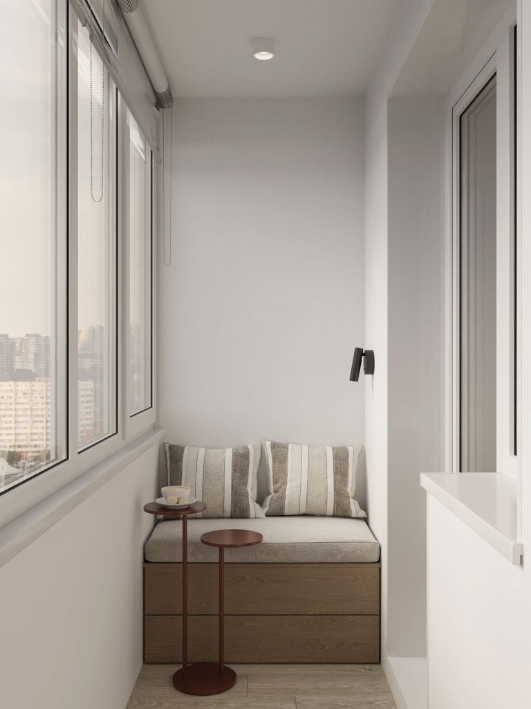 Этот уютный балкон стал идеальным уголком для отдыха и уединения. Мягкая скамья с подушками и элегантный столик создают комфорт для чашечки кофе или книги. Панорамные окна открывают прекрасный вид на город, а растения придают свежесть и живость. Легкие занавески и мягкий свет создают атмосферу легкости. Полки для книг и декора делают пространство функциональным и стильным, подходящим как для работы, так и для отдыха.