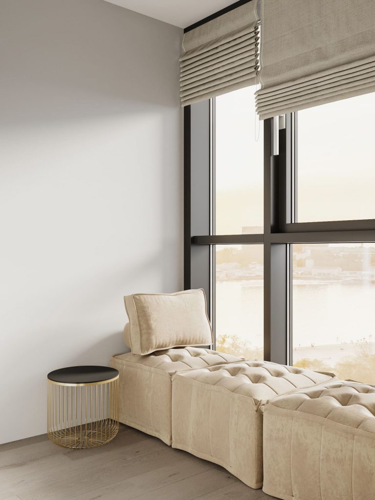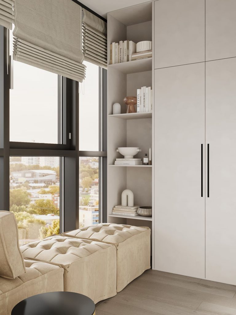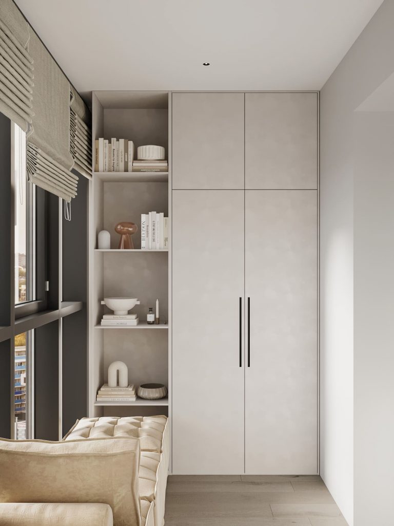 На балкон из-за небольших габаритов квартиры, как и хотела заказчица, вынесена компактная зона отдыха, как дополнение к гостиной. Она представлена эргономичным диваном без спинки с мягким подлокотником-подушкой (с левой стороны) приятного молочного оттенка и красивым кофейным столиком в контраст к нему с чёрной крышкой и золотистым основанием-струнами. Потому, здесь приятно и отдохнуть одной, наслаждаясь пейзажем за окном, и устроить вечерние атмосферные посиделки с друзьями. Также, тут имеется система хранения в виде модуля с открытыми полками для книг и декоров и двухдверный шкаф.