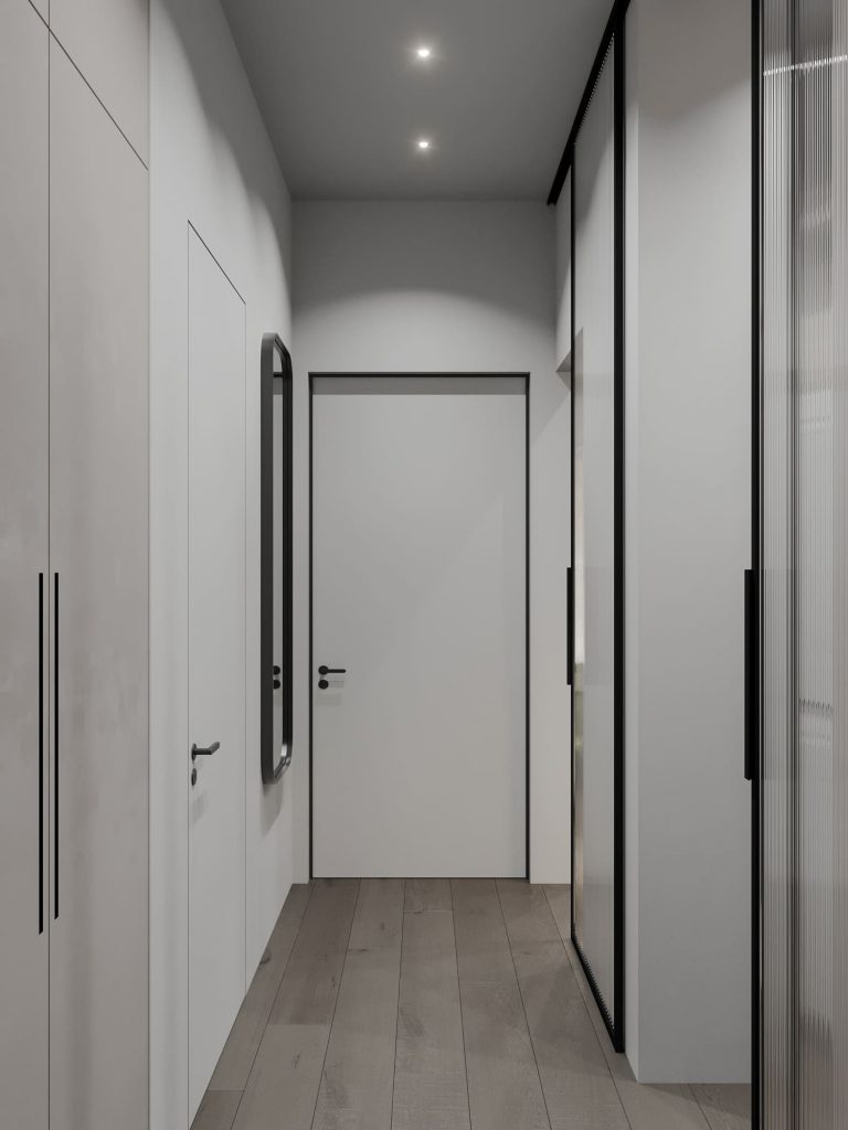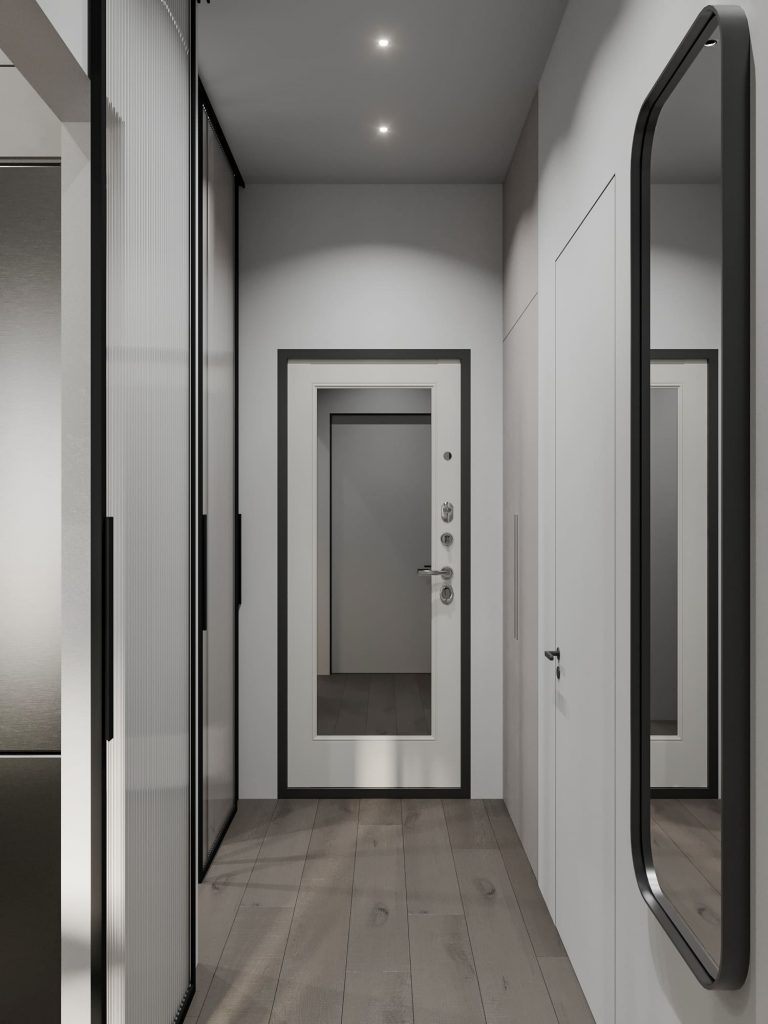 Прихожая поддерживает общую концепцию - в ней нет ничего - только к входной двери примонтировано зеркало, чтобы посмотреться перед выходом на улицу. Гардеробный шкаф здесь (вместо заявленной гардеробной) - встроенный двухдверный - входящий видит только двери без всяких выступов, и создается ощущение, что прихожая совершенно пустая и поэтому - просторная, а вся обувь и верхняя одежда хранится в гардеробном шкафу.