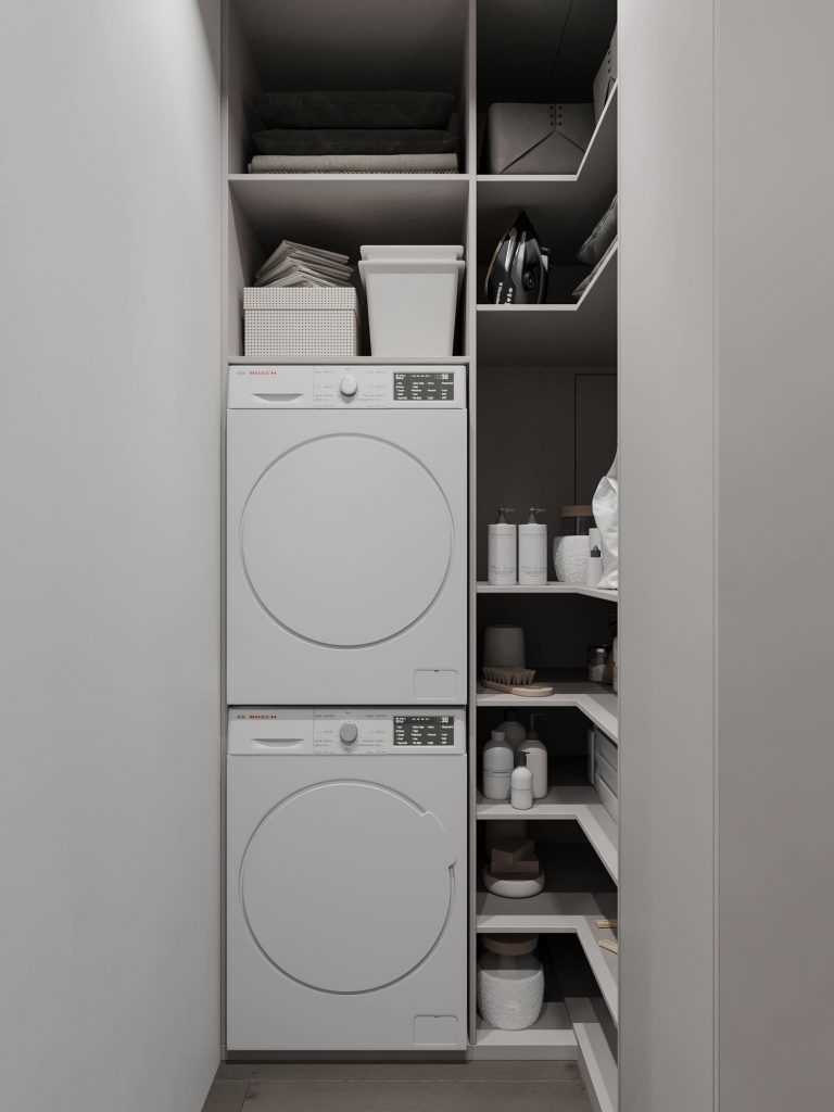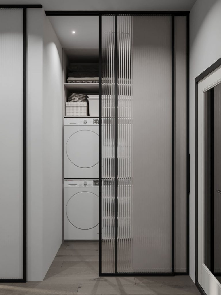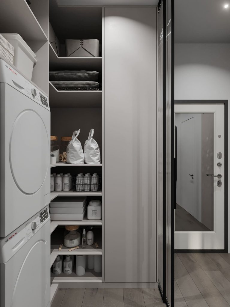 Постирочная добавлена по просьбе заказчицы в прихожей за раздвижными дверями. Здесь в открытых секциях размещены стиральная и сушильные машины, на ними - полки для стиральных порошков и прочего. По другую сторону также идут открытые секции для порошков, кондиционеров, подушек и других средств для стирки и вещей.