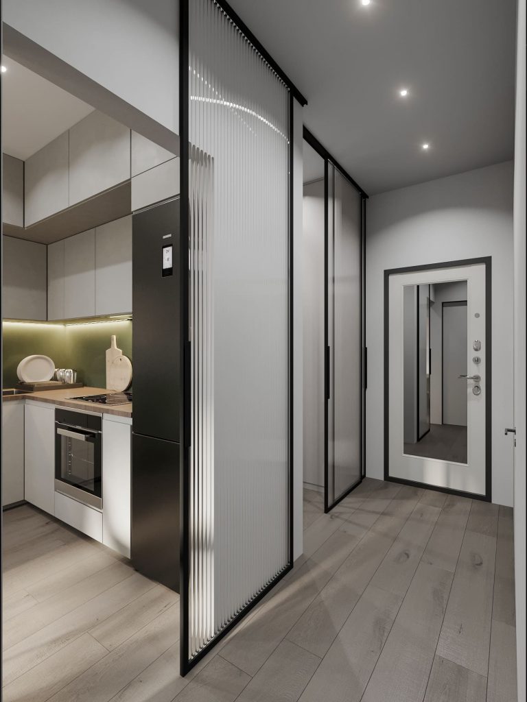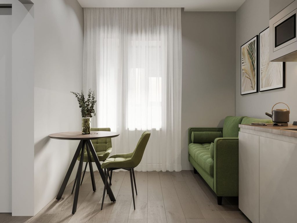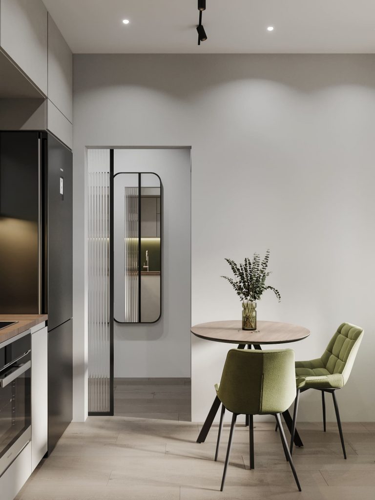 Светлая однокомнатная современная квартира с оливковыми акцентами