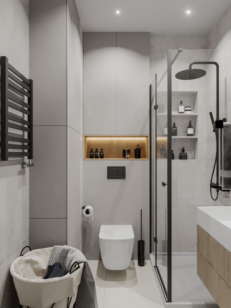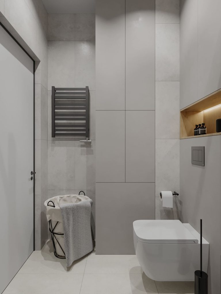 Система хранения ванной очень функциональна - всё по рукой - полочки-ниши в душевой и полка-ниша над унитазом. Также, для дополнительного удобства здесь размещены полотенцесушитель, красивая корзина для белья, полотенцедержатель на стене около раковины, а полки-ниши имеют приятную тёплую подсветку.