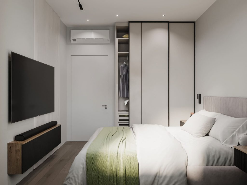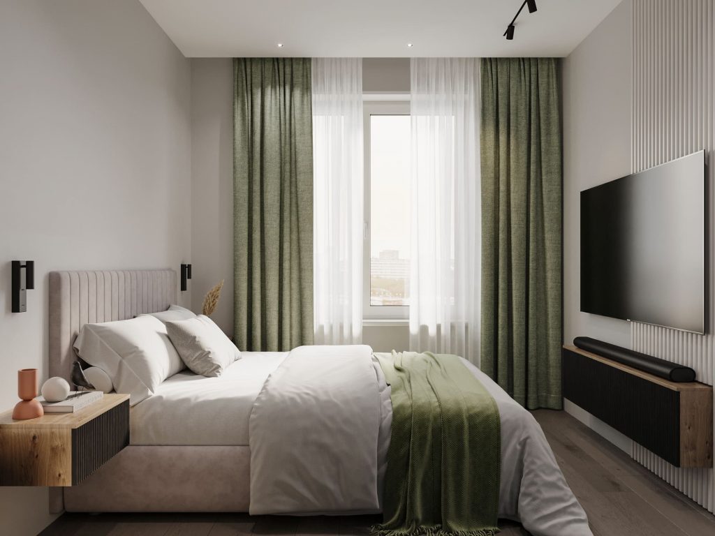 Спальня выдержана в таком же стиле, как и кухня - основной цвет - светло-серый с оливковыми акцентами. С одной стороны - здесь есть все, что нужно, с другой - нет ничего лишнего. В комнате - только большая комфортная кровать с мягким изголовьем с подвесными прикроватными тумбочками; большая ТВ панель с очень узкой ТВ тумбой (в таком же стиле, как прикроватные тумбы), чтобы свободно проходить к входной двери; вместительный гардеробный шкаф-купе. Комната очень светлая за счёт большого окна, отделки стен, мебели и текстиля. А вечером бра над кроватью, системы светильников над ТВ панелью и около гардеробного шкафа создают необходимую атмосферу - релакса, комфорта, хорошего настроения.