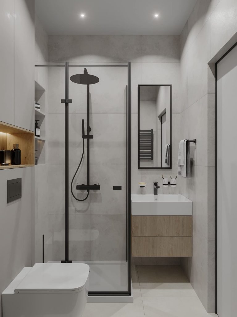 В душевой - минимум необходимых функциональных элементов - собственно, душевая кабина за стеклянными прозрачными дверями и перегородками, чтобы не “разрезать” пространство непрозрачным материалом, тем сокращая визуально и так небольшую комнату; раковина с подвесной тумбой; подвесной унитаз.