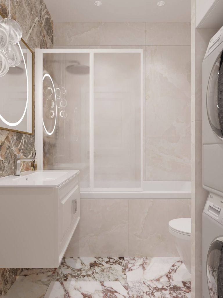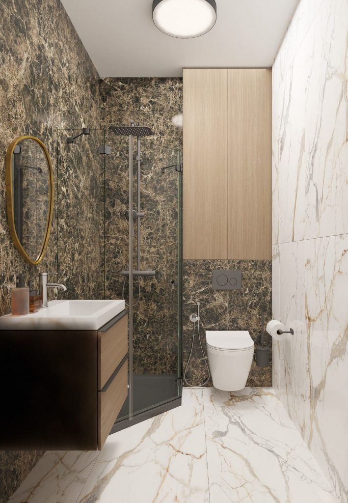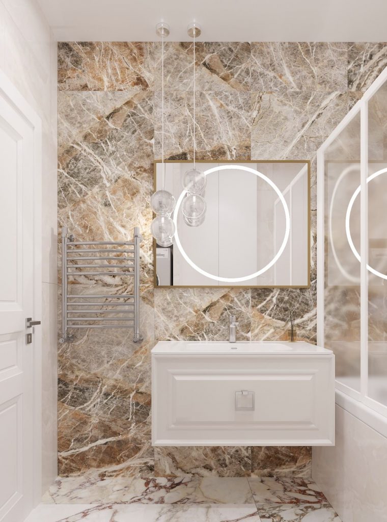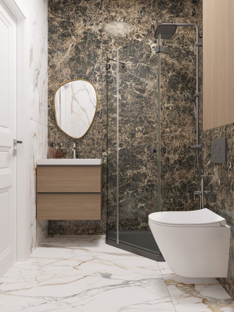 Санузлы оформлены в изысканном стиле под мрамор, что придает им утонченность и ощущение простора. Широкоформатный итальянский керамогранит с выразительным мраморным узором создает эффект роскоши и гармонии.