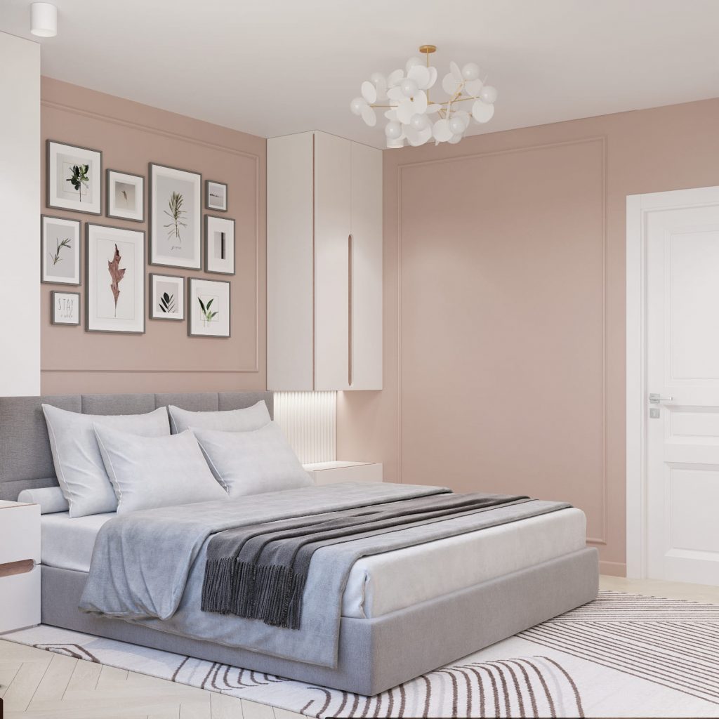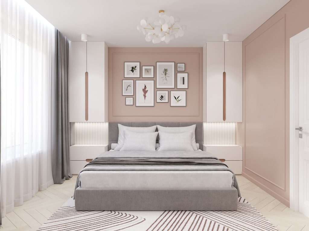Спальня оформлена в сдержанном и уютном стиле, где центральное место занимает кровать с панно из семейных фотографий над изголовьем, добавляющим теплоту и индивидуальность пространству. Шкаф во всю стену не только обеспечивает вместительное хранение, но и включает встроенный телевизор, что позволяет удобно наслаждаться просмотром фильмов перед сном. Интерьер спальни гармоничен и функционален, объединяя эстетичный декор и практичное использование пространства.