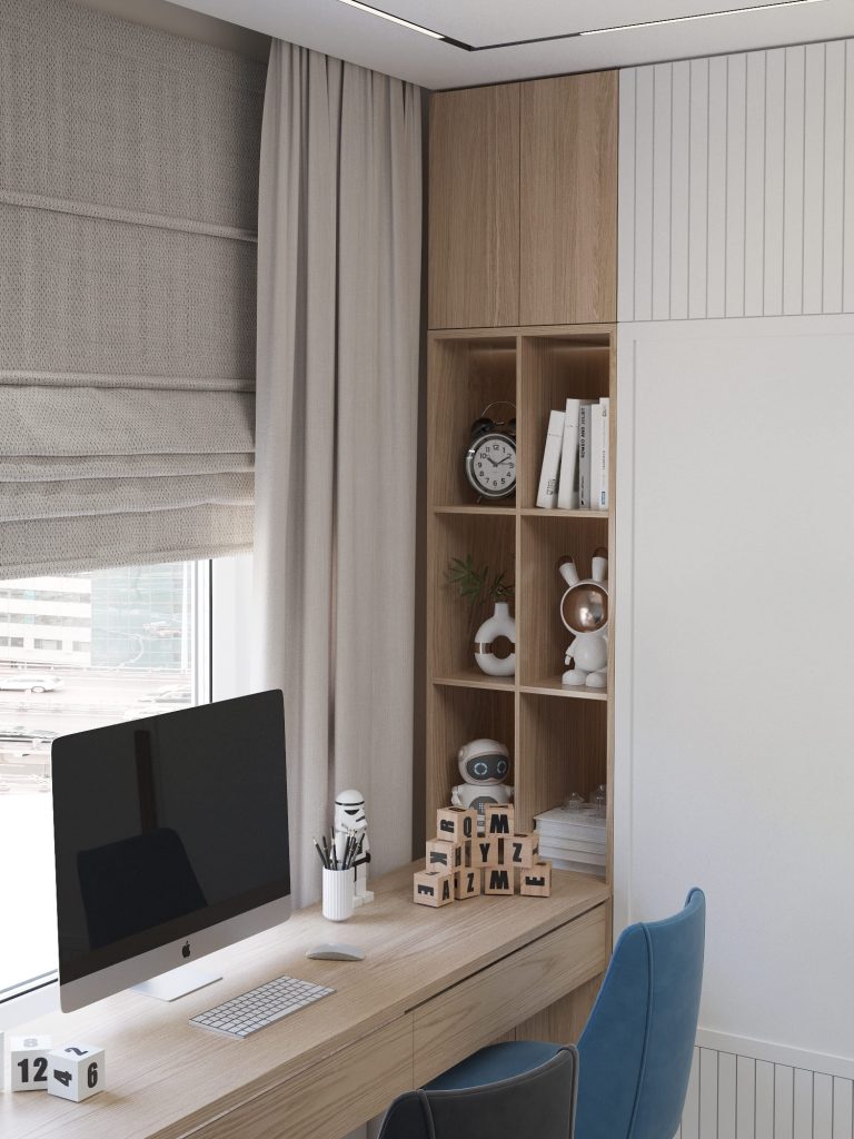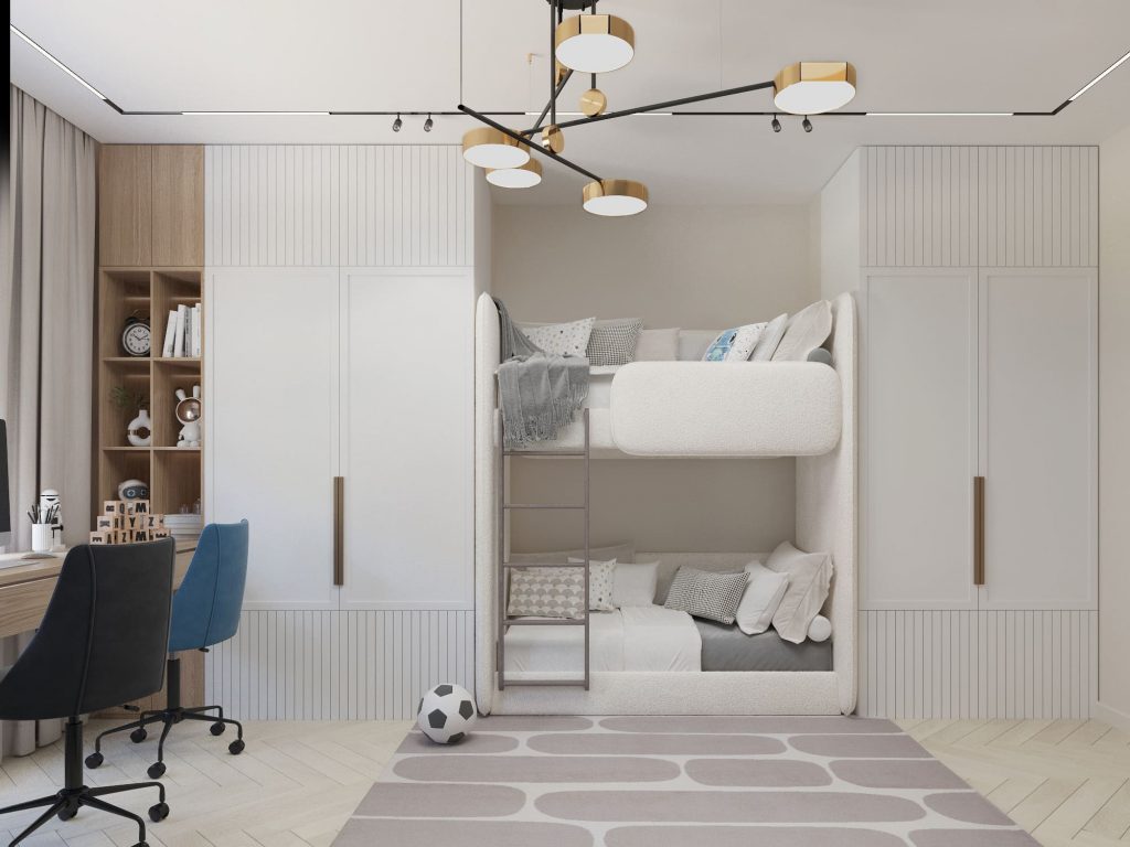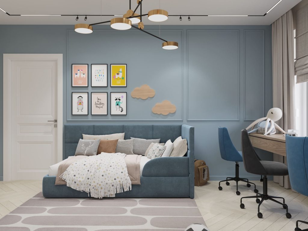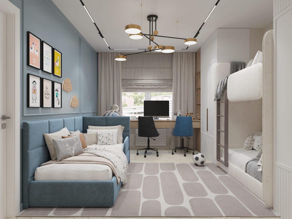 Детская оформлена в нежных голубых тонах, создающих спокойную и уютную атмосферу для трех сыновей. В комнате расположена двухэтажная кровать, которая экономит пространство и позволяет комфортно разместить младших детей. Дополнительно предусмотрена зона для учебы — длинный стол вдоль окна, за которым все трое могут заниматься одновременно. Яркие, но ненавязчивые акценты в декоре добавляют комнате жизнерадостности, делая её идеальным местом для учебы, отдыха и игр.