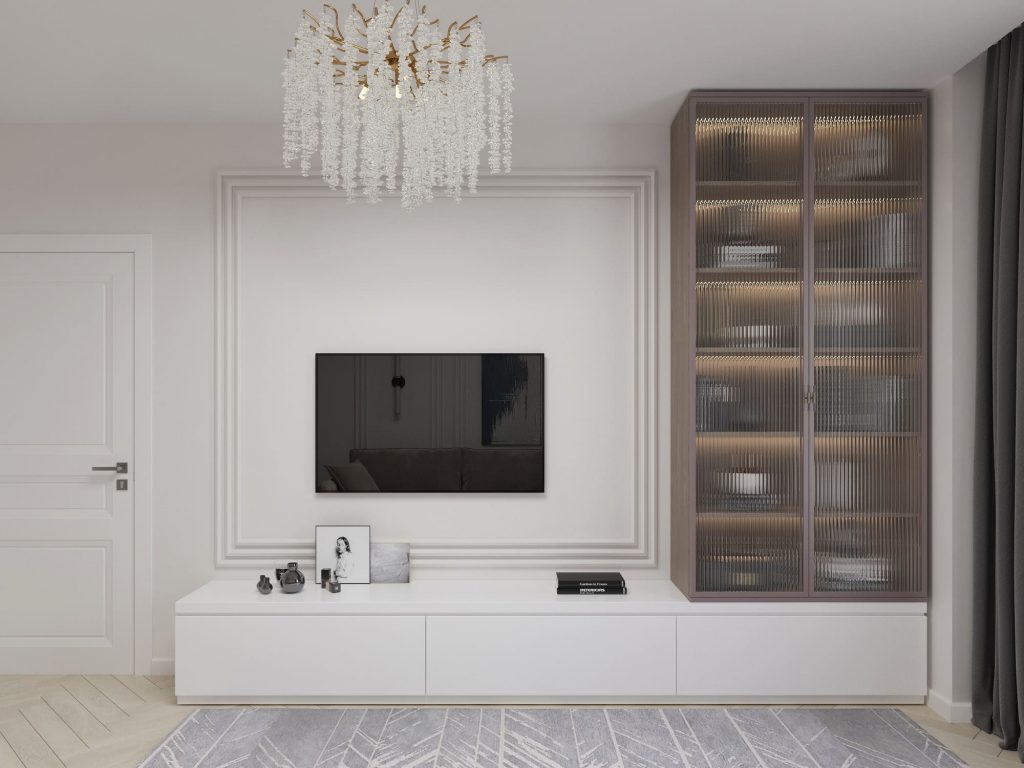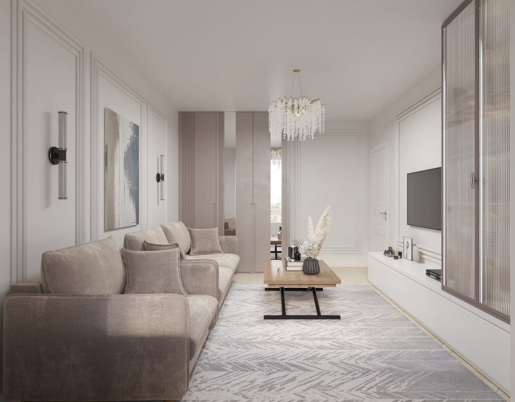 Гостиная оформлена в светлых тонах с элегантными молдингами на стенах, добавляющими неоклассическую нотку в современный интерьер. В центре зоны отдыха — удобное кресло, которое по вечерам трансформируется в спальное место для дочери заказчиков, обеспечивая ей уютный уголок для сна. Пространство остается просторным и многофункциональным, создавая атмосферу комфорта и тепла для всей семьи.