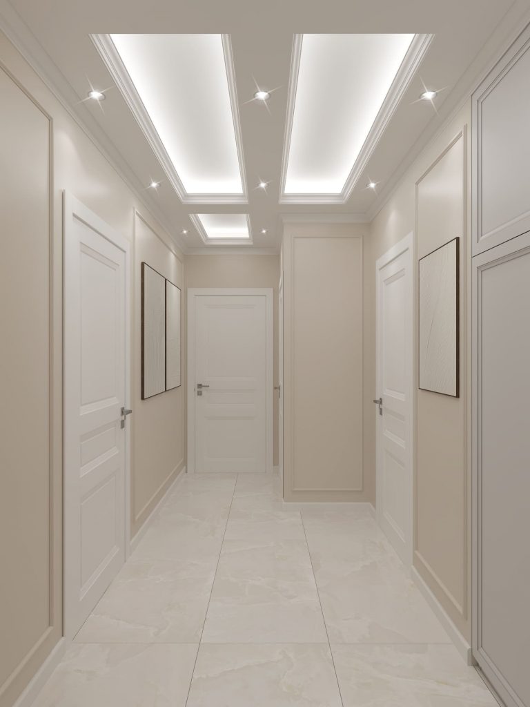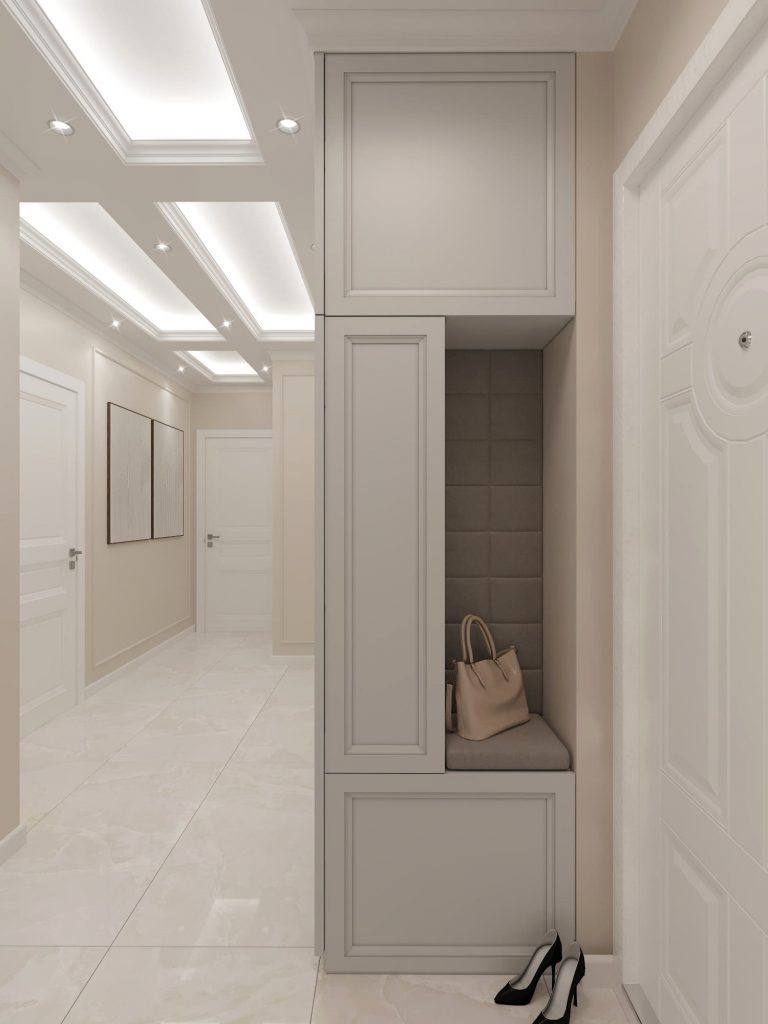В прихожей царит светлая и легкая атмосфера, без лишних деталей и перегруженности. Основой стала минималистичная отделка с использованием светлых оттенков, визуально расширяющих пространство. Кессонный потолок с мягкой подсветкой добавляет глубину и объем, придавая прихожей элегантность и уют, оставаясь при этом функциональной и простой для быта семьи.